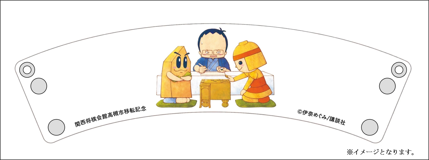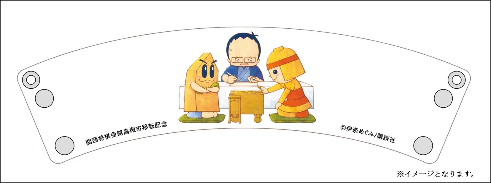 ・作家 伊奈めぐみさんによる「将棋の渡辺くん」、「日本将棋連盟公式キャラクターSHOちゃん」、「高槻市マスコットキャラクターはにたん」の書き下ろしイラストがデザインされています。