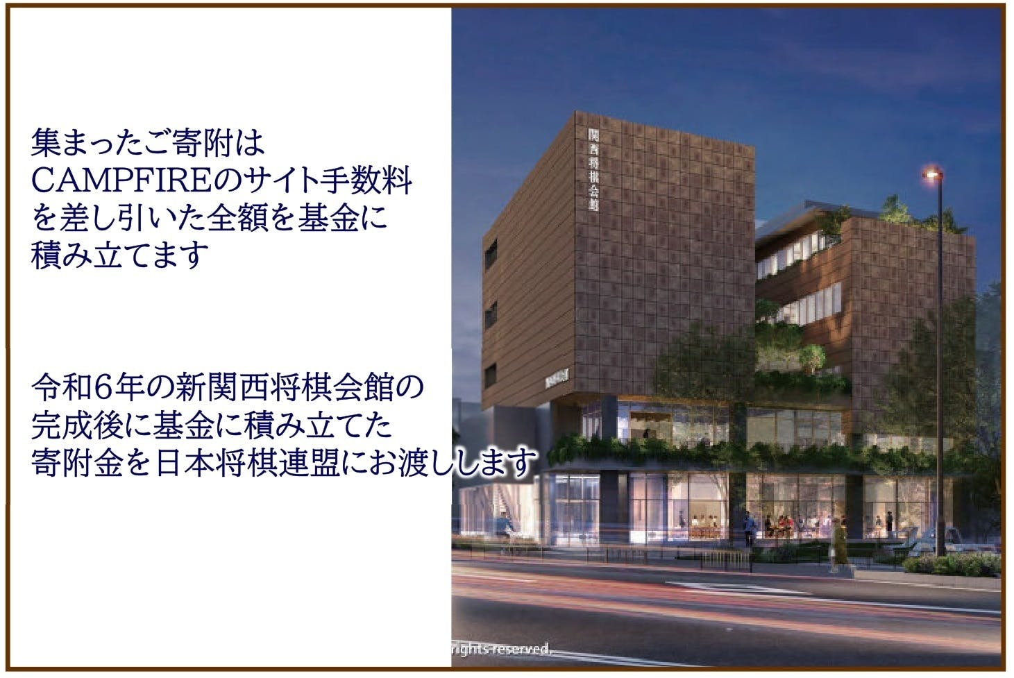 ぜひ、皆様、関西将棋会館の完成を楽しみにしていただくともに、ご支援とご協力を頂けますよう重ねてお願いいたします。