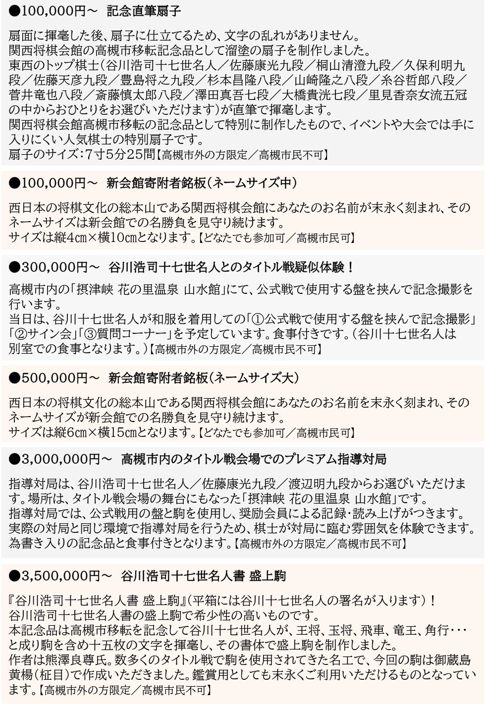 2024/12/18 12:00平素より「関西将棋会館建設プロジェクト」にご支援とご協力を賜り、厚く御礼申し上げます。新関西将棋会館に設置している寄附者銘板につきましては、令和6年12月3日のグランドオープンに設置を間に合わせるため、施工の都合により第4期クラウドファンディングを最終募集とし、令和6年3月31日に締め切らせていただきました。しかしながら、その後も寄附者銘板へのお申込みのお問い合わせが多数寄せられており、また設置スペースを捻出できたことから、この度、追加募集を実施することといたしました。数量限定での募集ですので、ご希望の方はぜひお早めにお申込みください。【詳細】新関西将棋会館 寄附者銘板新会館のエントランスに末永くお名前が刻まれ、新会館の歴史を見守り続けます!・ネームサイズ大(寄附額500,000円)※限定2名・ネームサイズ中(寄附額100,000円)※限定20名・ネームサイズ小(寄附額50,000円)※限定40名令和6年12月19日(木)12時から募集を開始いたします。皆さま、ぜひ最後の一押しを何卒よろしくお願い申し上げます。第5期関西将棋会館建設プロジェクトFINAL もっと見る一門対抗団体戦の観戦イベントの参加棋士の決定について