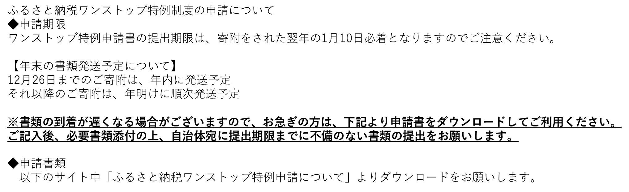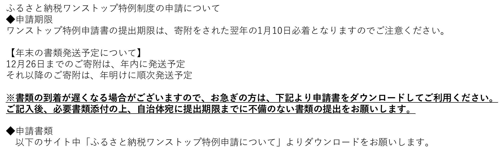 ※寄附(ふるさと納税)を行うと、寄附金受領証明書(確定申告用)、希望者にはワンストップ特例申請書が届きますので、大切に保管し所定の手続きを実施してください。