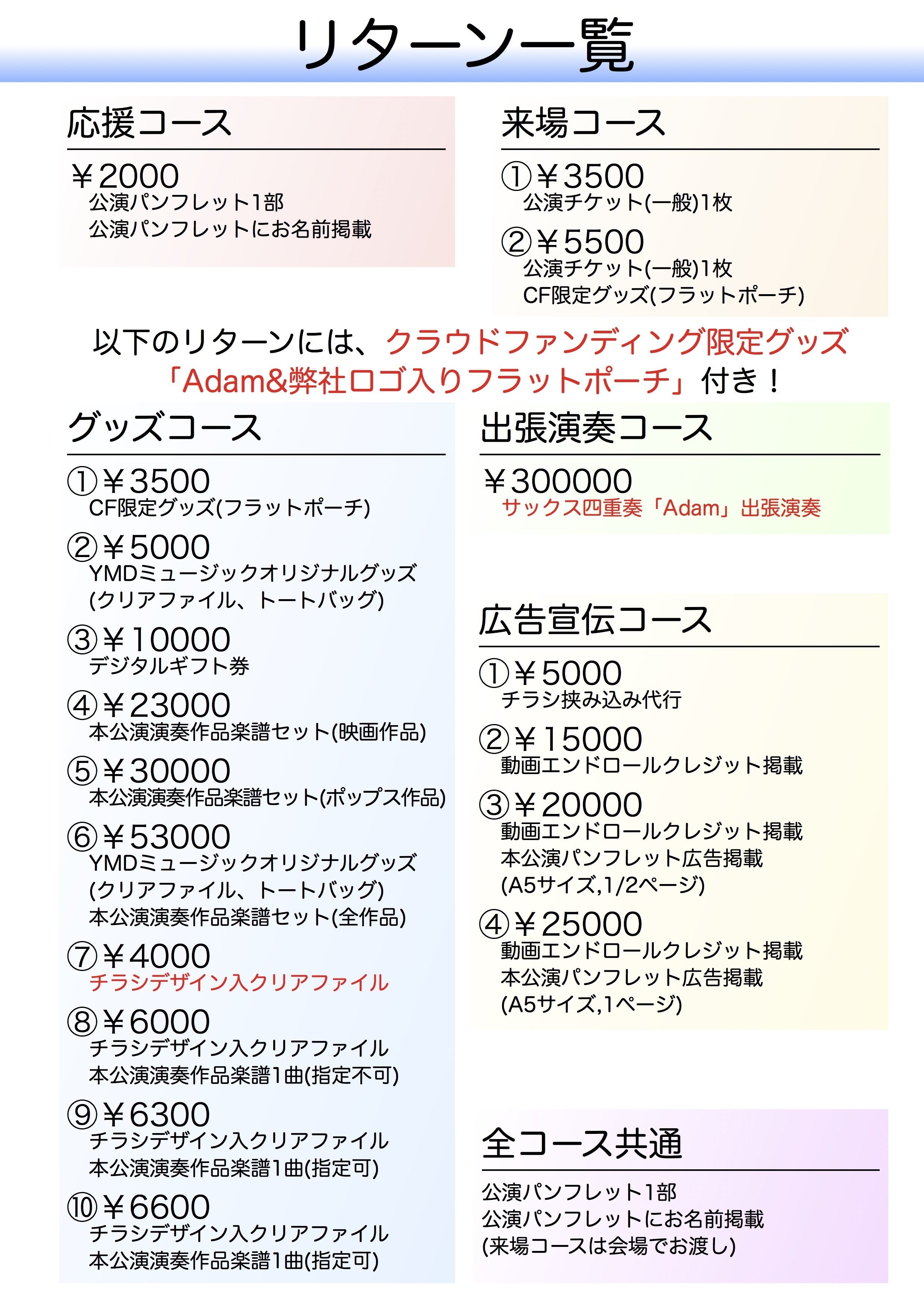 クラウドファンディングのリターンとして、演奏会パンフレットや限定フラットポーチ、本公演のチラシがプリントされたクリアファイル等をご用意しております。