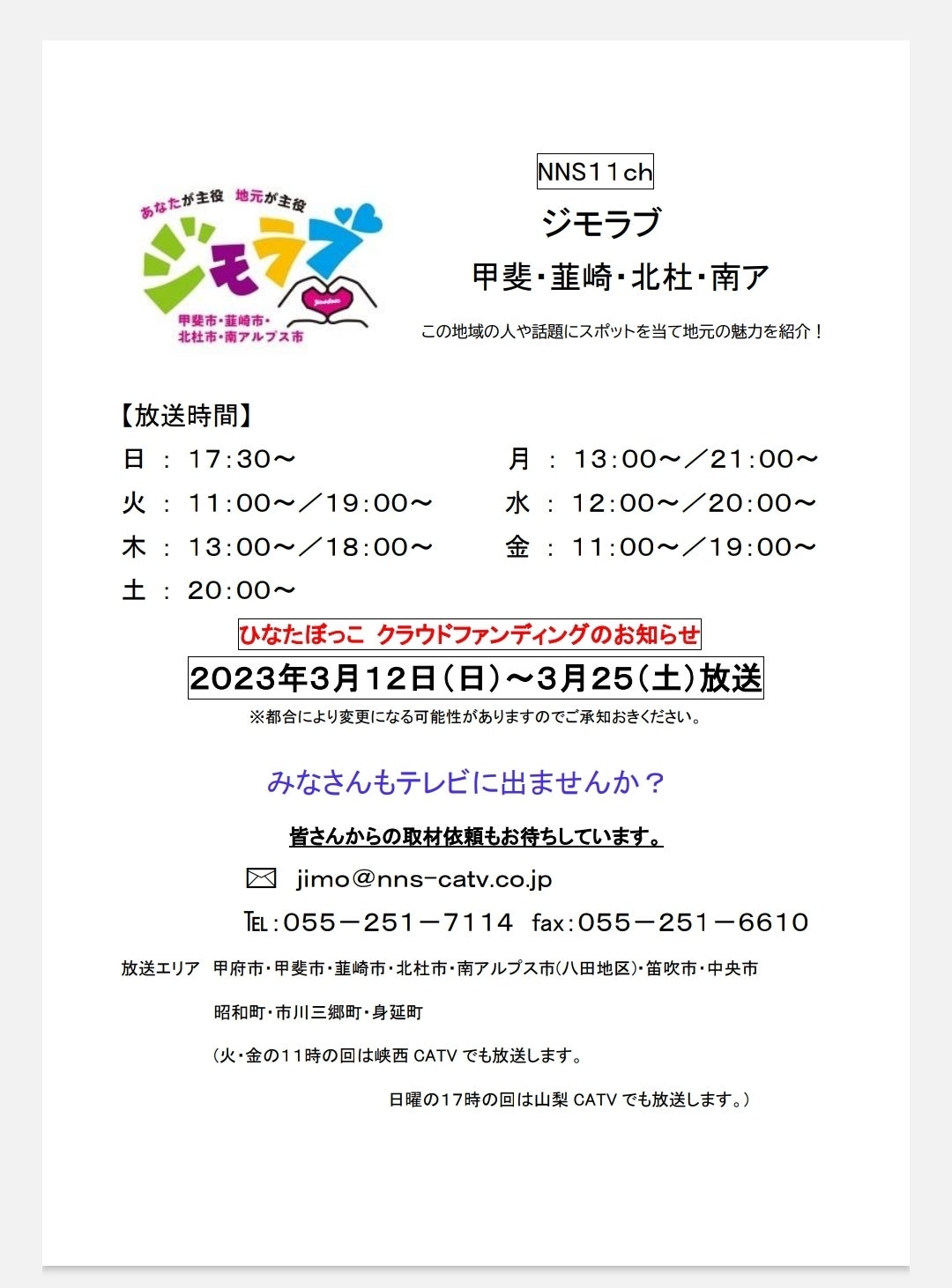 なんと、ひなたぼっこのクラウドファンディングの紹介が今日から2週間、地方放送・NNS11チャンネルの『ジモラブ』で放送されます!