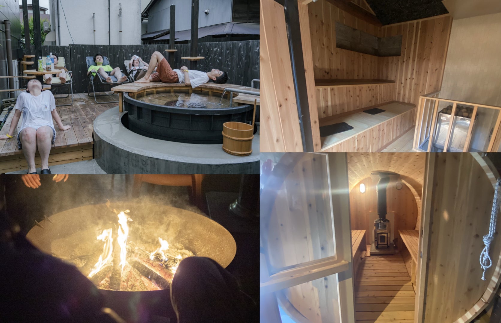 薪火とガスの2つのサウナ、富士山の雪解け水の風呂、焚き火と整いスペースが完備