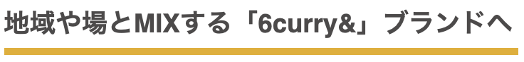 6curryKITCHENは「カレー」を食べながら、ワクワクするような人との出会いを楽しむ場でした。これから地域へと展開していくときに、カレーだけでなく「地域や場の特色を取り入れたヒトとの繋がりをデザインする場」へと進化して行きたいと思っています。店舗名を「6curry&○○※地域や場ならではのコト・モノ」として統一していきます。
