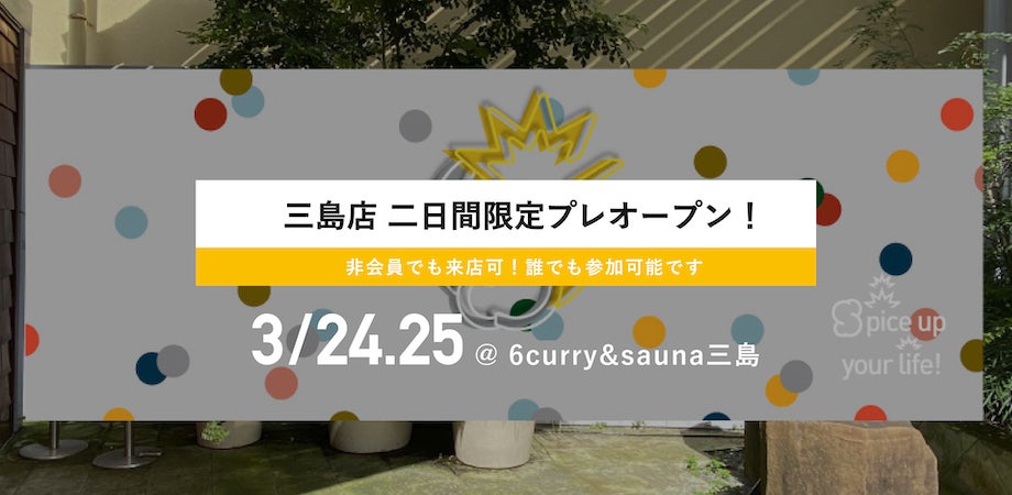 4月1日から三嶋大社前にOPENする会員制のカレー屋「6curry&sauna三島店」が、3/24,25の二日間限定で、非会員でも来店可能なプレオープンイベントを開催します!