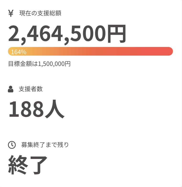 188名の方にご支援をいただき、達成率164%、2,464,500円という大幅な目標達成をすることができました。本当にありがとうございます!