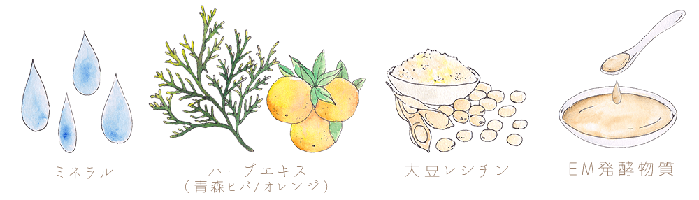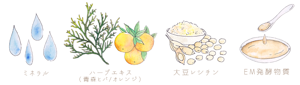 □主原料は「ミネラル」「ハーブエキス(青森ヒバ・オレンジ)」「大豆レシチン」「EM発酵物質」