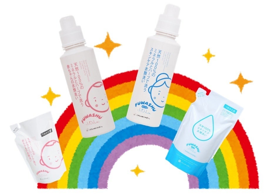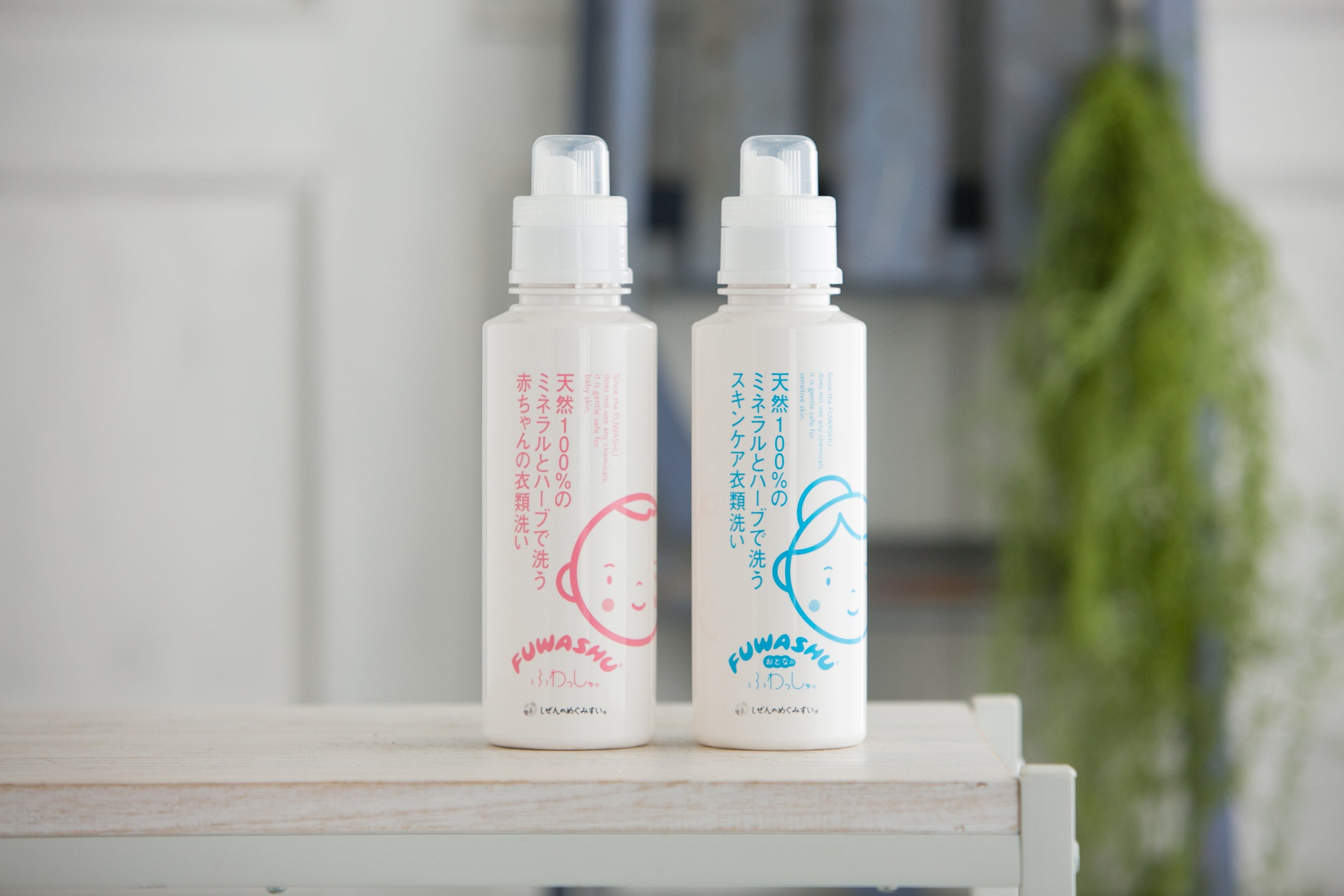 衣類洗い「ふわっしゅ」シリーズは、「ふわっしゅ」と「おとなのふわっしゅ」の2種類。いずれもお肌に刺激を与えないよう、合成界面活性剤や香料等の化学物質を一切使用せず製造しています。もちろん原材料に使っているものは全て日本製です。食品もしくは食品に準ずる原料しか使っていないので、お肌に優しく万が一口に入ったとしても心配ないくらい安全な衣類洗いです。