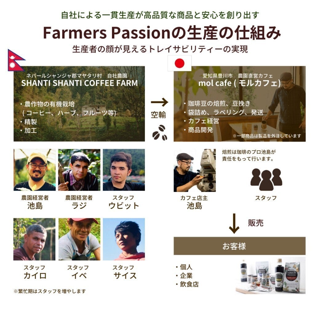 本当に美味しいコーヒーをつくりたいという思いから、私たちファーマーズパッションは、その理想の一杯を追求するために、コーヒー豆の産地であるネパールで豆の生産を始めました。
