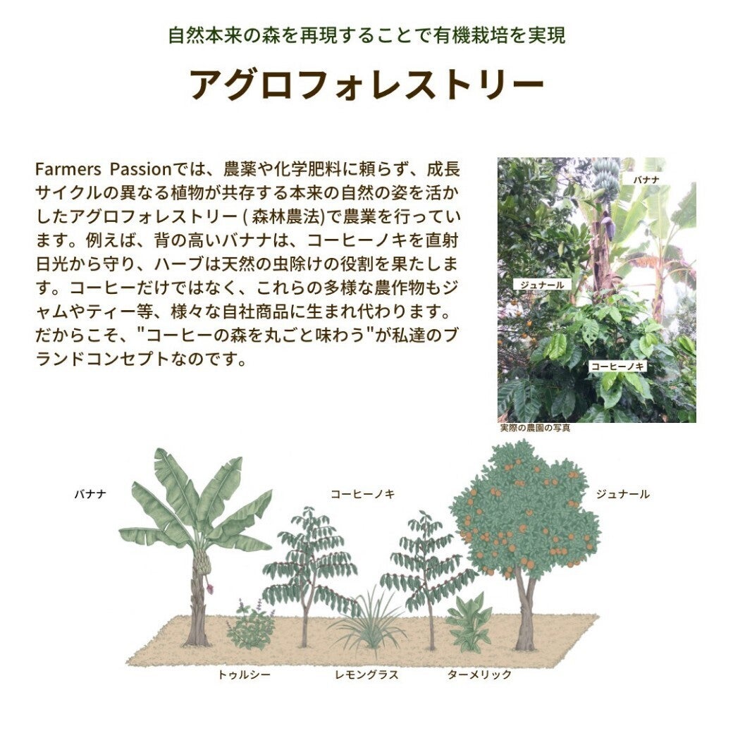 農薬や化学肥料に頼らず、高木で日陰をつくり、スパイスで虫除けを行う、という自然の力を利用した栽培方法です。種まき、堆肥づくり、苗選び、環境整備、収穫など、すべての工程を人の手で行っています。