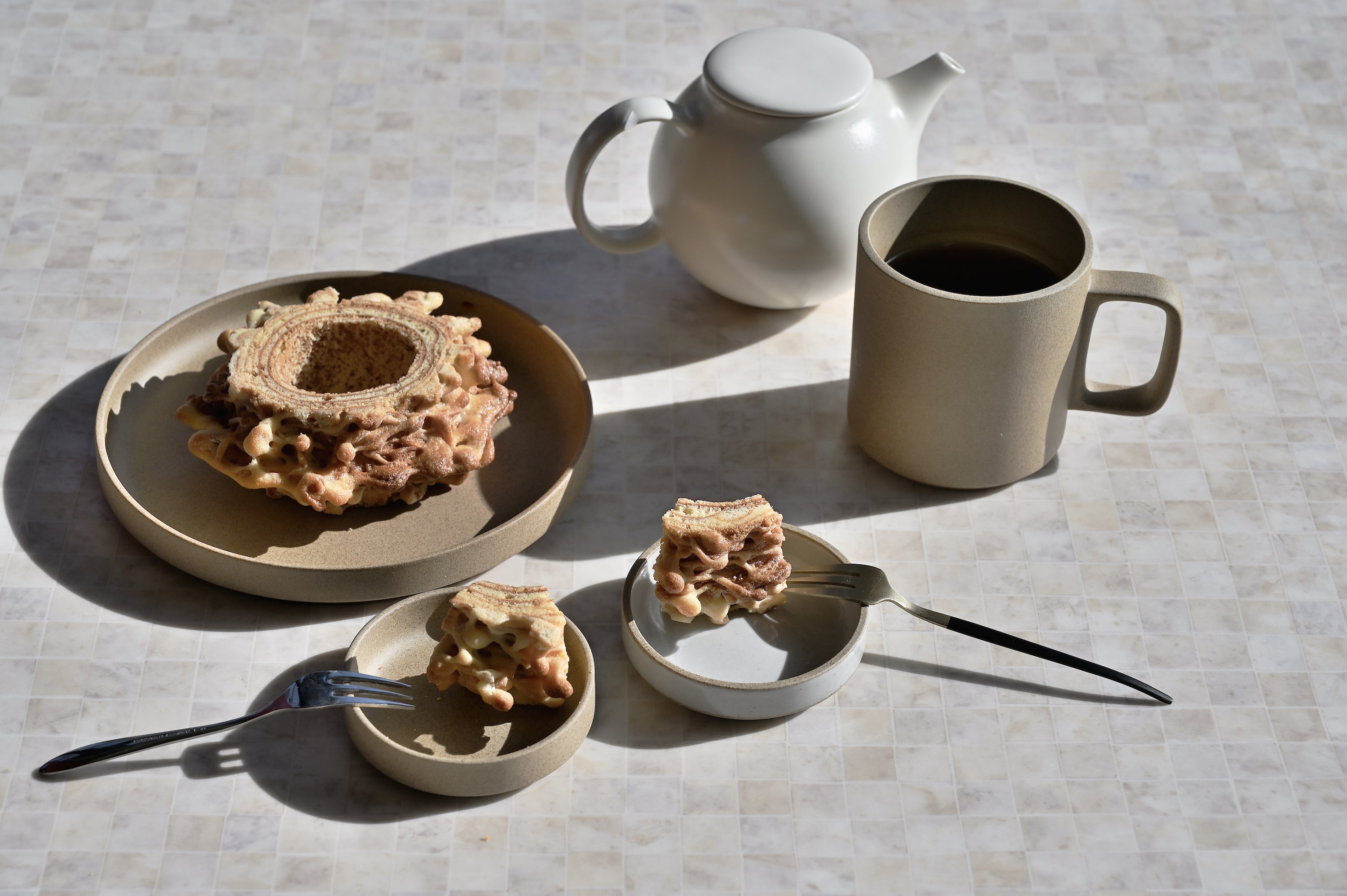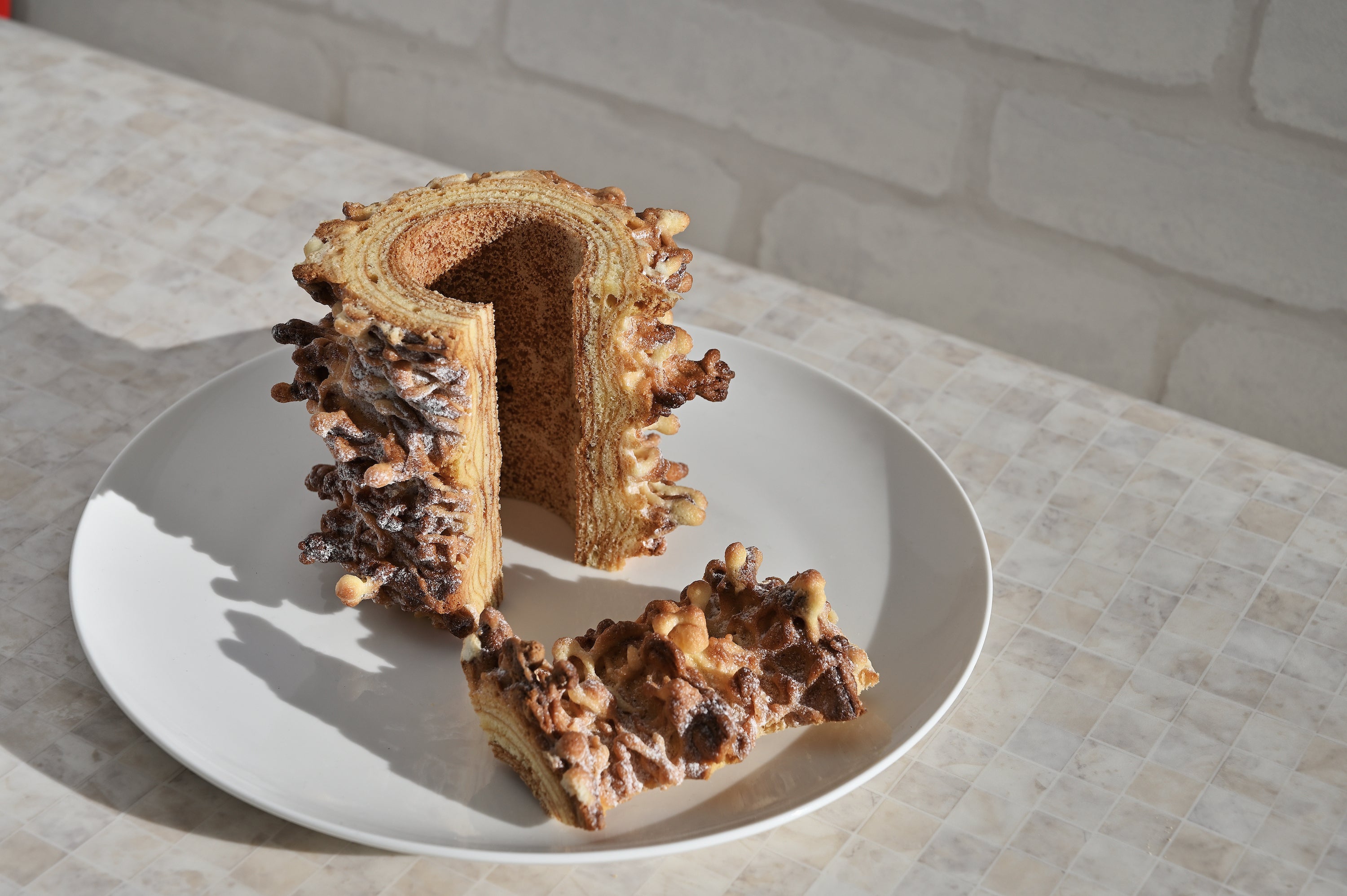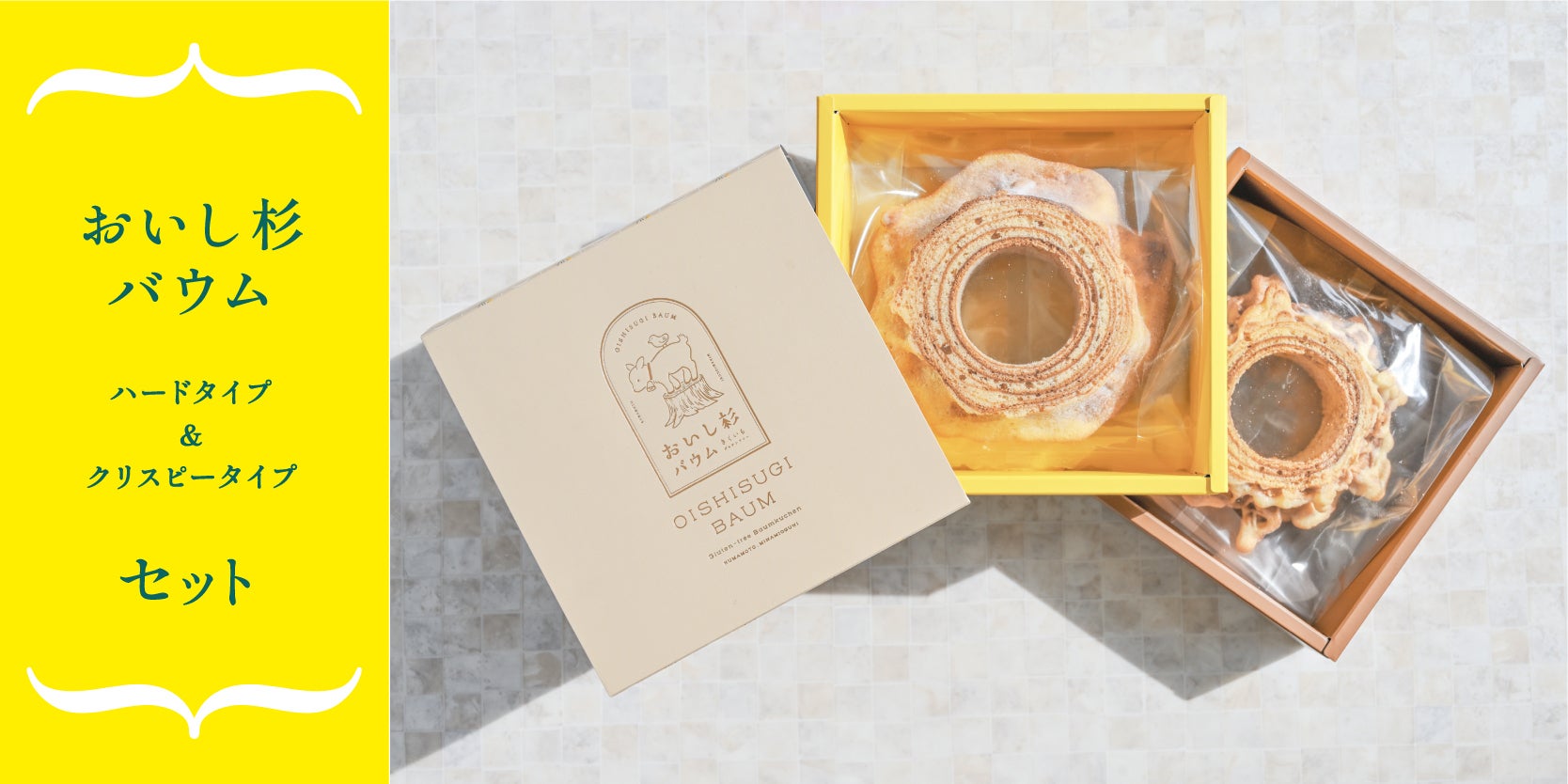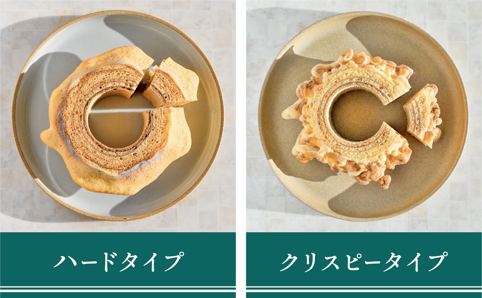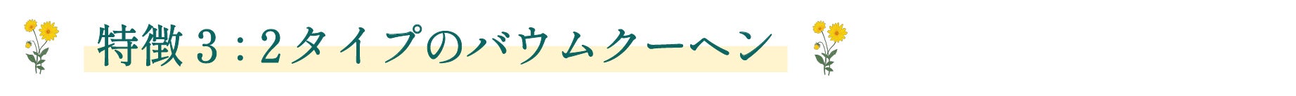 今回、小国杉を表現するため、ハードタイプとクリスピータイプの2種類のバウムクーヘンを用意しています。特に、クリスピータイプのバウムクーヘンは、外はカリッと中はもっちりとした2種類の食感が楽しめるとともに、見た目も小国杉に近い、珍しいバウムクーヘンとなっています。
