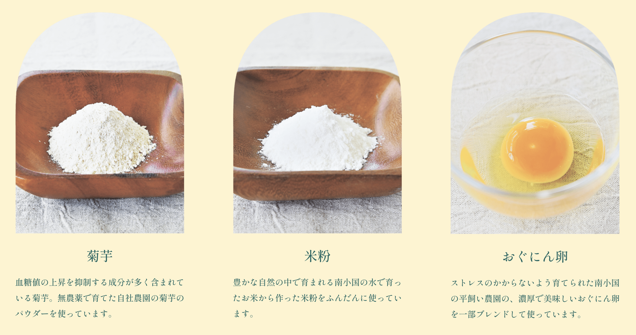米粉は自然豊かな南小国で育ったお米で作った米粉を使用し、卵は平飼いでストレスがかからないように育てられた、濃厚さが特徴の南小国産「おぐにん卵」を一部使用しています。