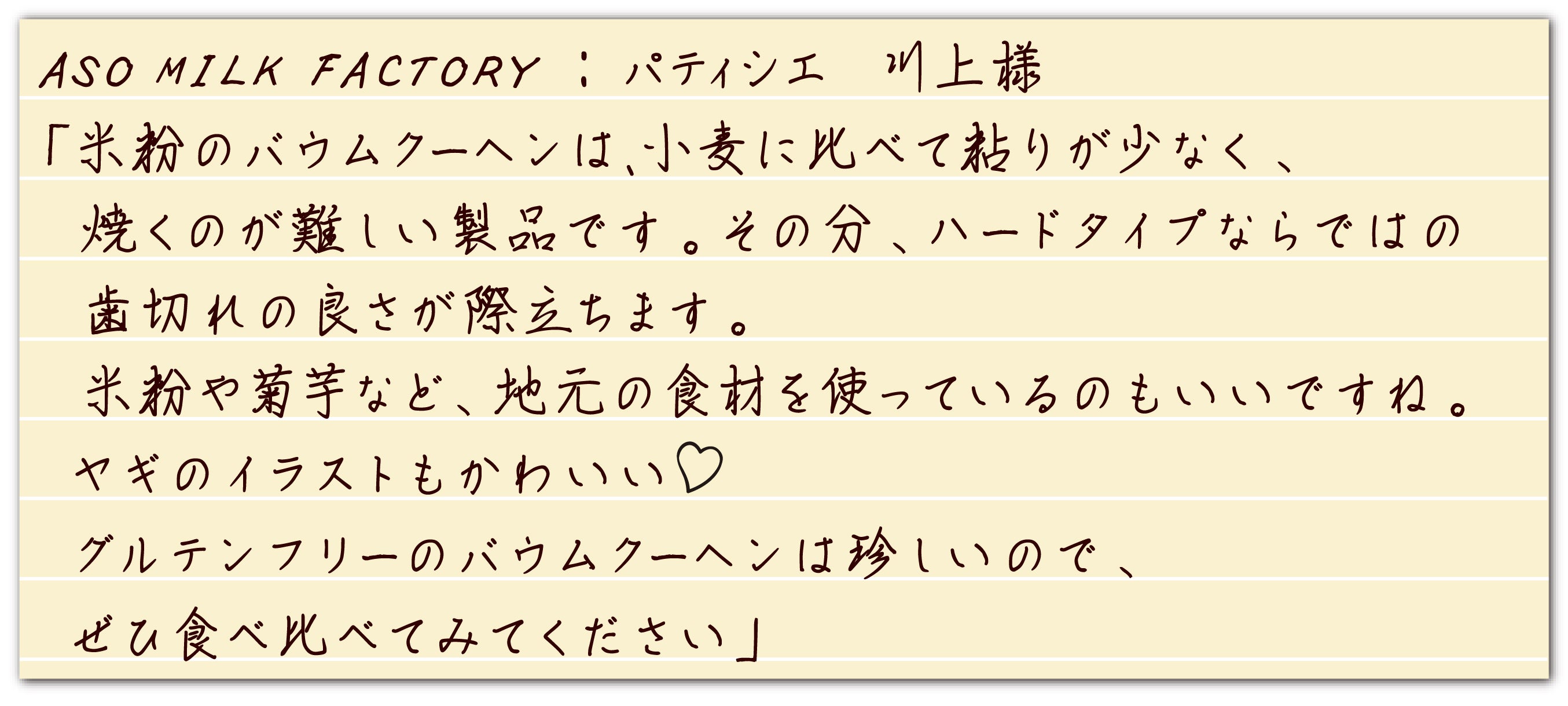 地域の特産品である小国杉を模した、南小国らしい商品となっておりますので、ぜひ多くの人に食べてもらえると嬉しいです。
