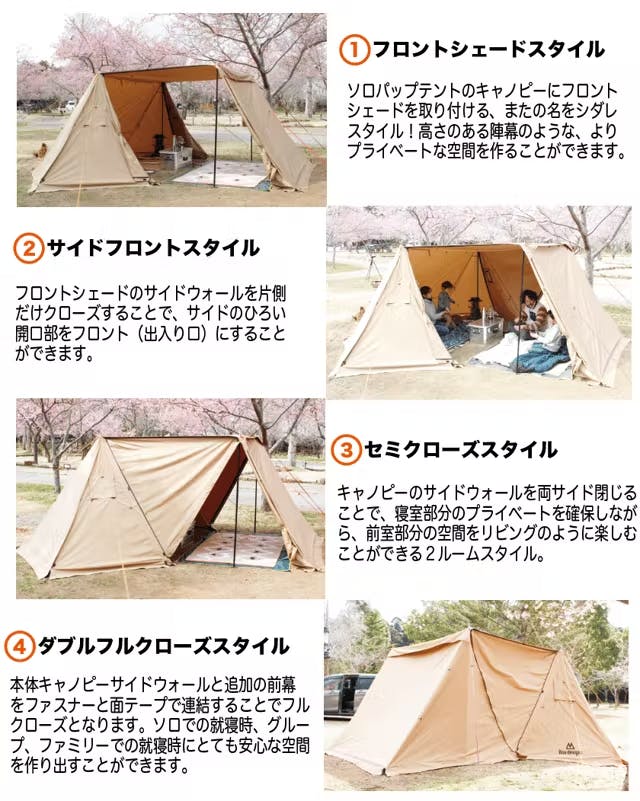 4面あるサイドウォールの組み合わせで、両面開放型のフロントシェードスタイルや、片面クローズで横面大開口の出入り口が確保できる、サイドフロントスタイル。まるで2ルームテントのような空間を創り出すことが可能です。組み合わせで演出できるスタイルは無限大!あなたの空想でファミリーキャンプがより一層楽しいものになるはずです。