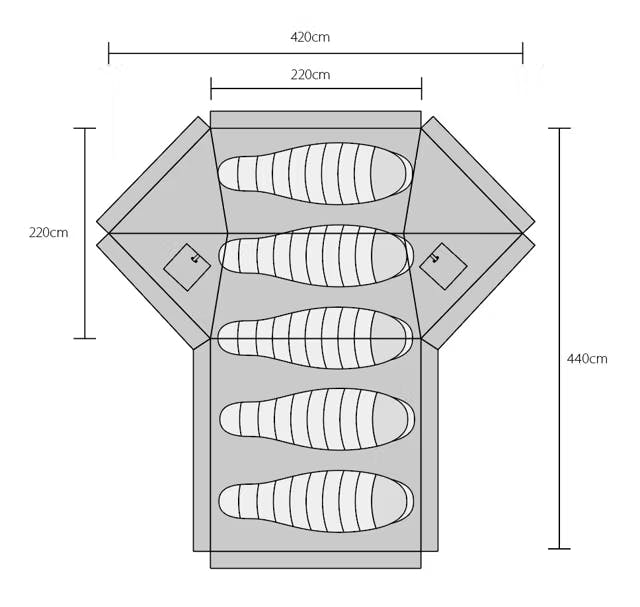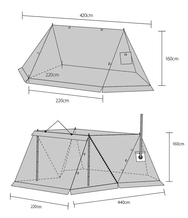 基本形態であるパップテントスタイルに前幕をファスナーでジョイントすることで、「transHOME-EX」はテント内の広さが通常のパップテントの約3倍の広さを作り出すことができます。
