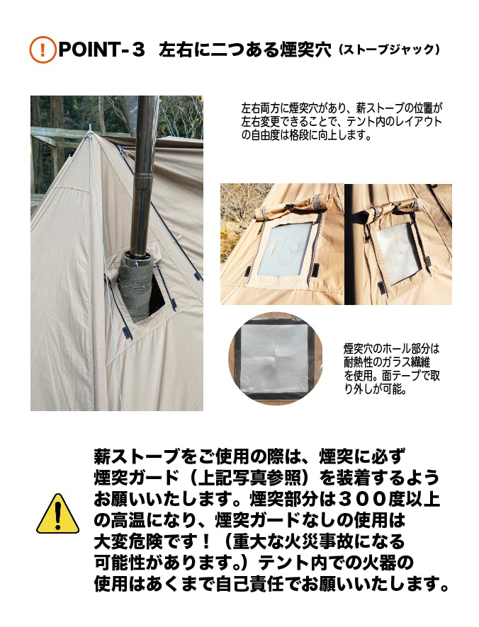 ※テント内でストーブを使用する際は、十分に換気をして一酸化炭素中毒や火災などに注意してご使用ください。(健康上の問題、火災などに関しましてはあくまで自己責任でお願いいたします。)