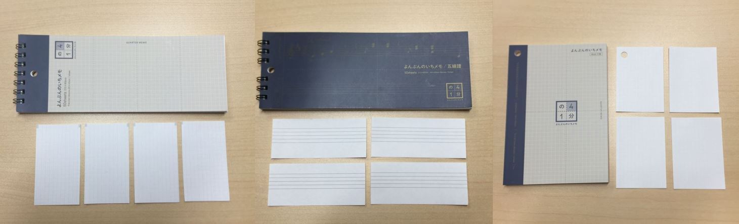 それが「よんぶんのいちメモ」製作着手のきっかけでした。ただし、これまでない要素も取り入れたいと思い、「ちょっと変わったミシン目を入れてみよう」と思いついたのです。なぜ「これまでにない要素」がミシン目なのか。それが前出のホームセンターのパトロール中にひらめいた内容だったのです。そこからどんどんアイディアが広がり、4種類のシリーズとなりました。