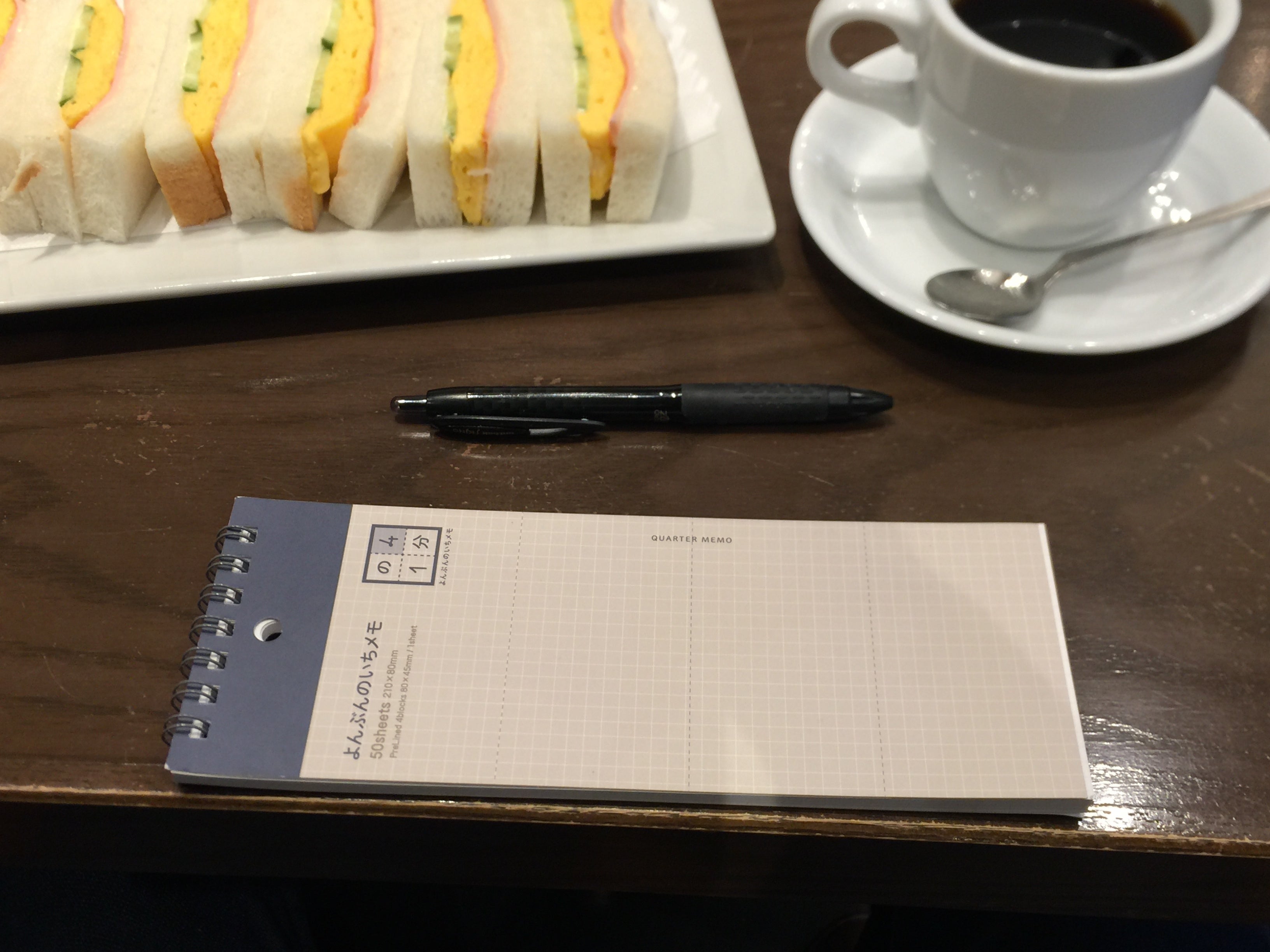 「横向き使い」に最適なサイズと型です。コーヒーターム、ランチタイム、一人飲みタイムに、その”時間とスペースのすき間”に「よんぶんのいちメモ スリム方眼」を滑り込ませてみませんか?テーブルの一番手前(自分側)に置いていただき、思いつたワードを書き留めていただくのに最適です。