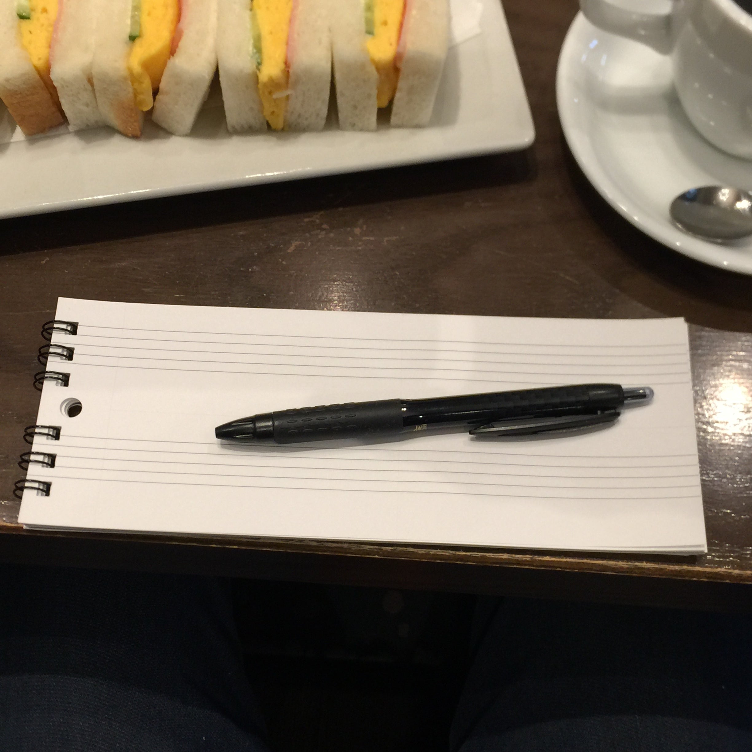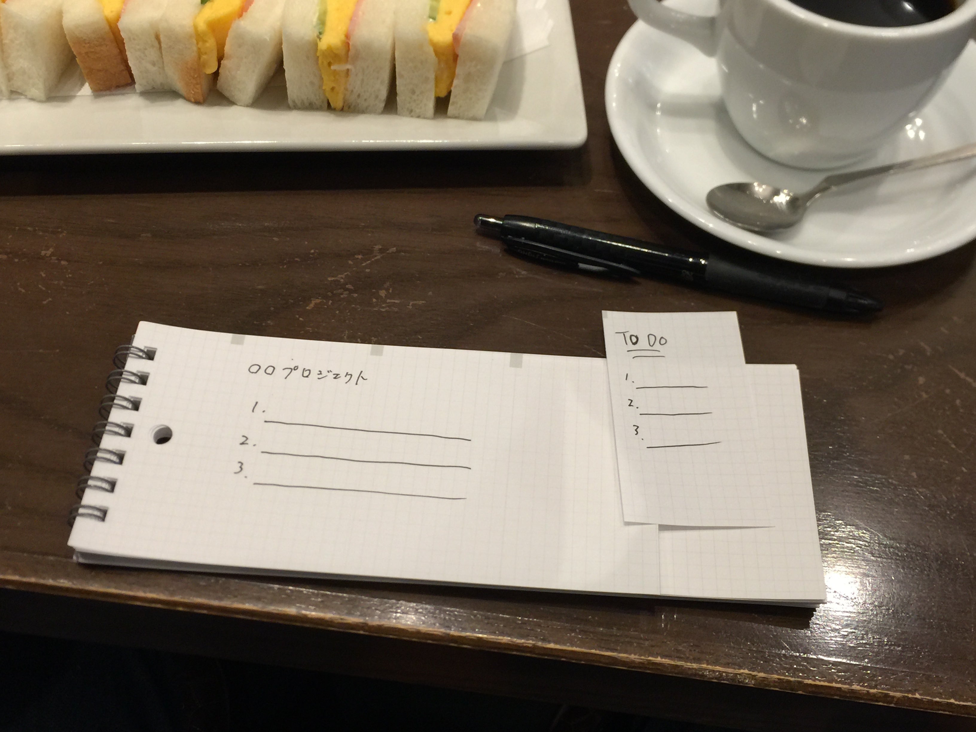 お箸や飲み物の真下あたりがベスポジです。ちょうどおへその前だと思ってください。肘をついたら隠れますし、さりげなくスマートにアイディア出しができます。他にもTo Do、ひらめいたワード、イラスト、はたまたちょっとしたグチなどが湧き出てくることでしょう。いや、もしかしたら、ポエム?歌詞?あの人への手紙?も飛び出てくるかもしれません。