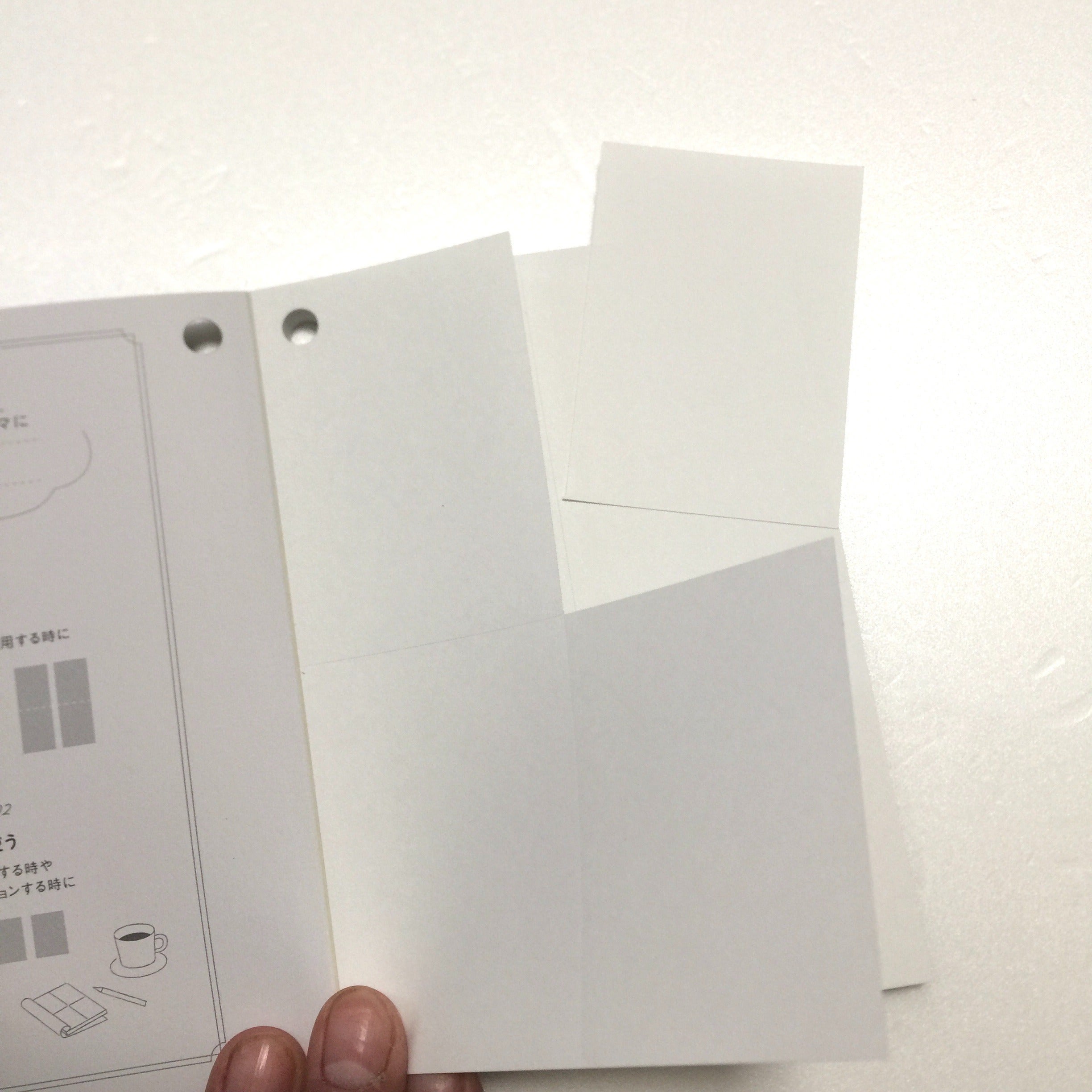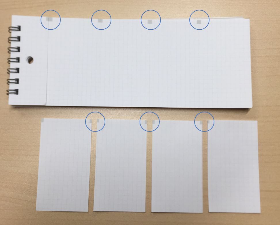 〇またA6タイプは非常に強力な糊を採用し、途中のページをページごと切りはなしても、他にページには全く影響しません。ミシン目をちぎって使う場合は頭から、1ページまるっと使いたい場合は途中から使っていただければOKです。