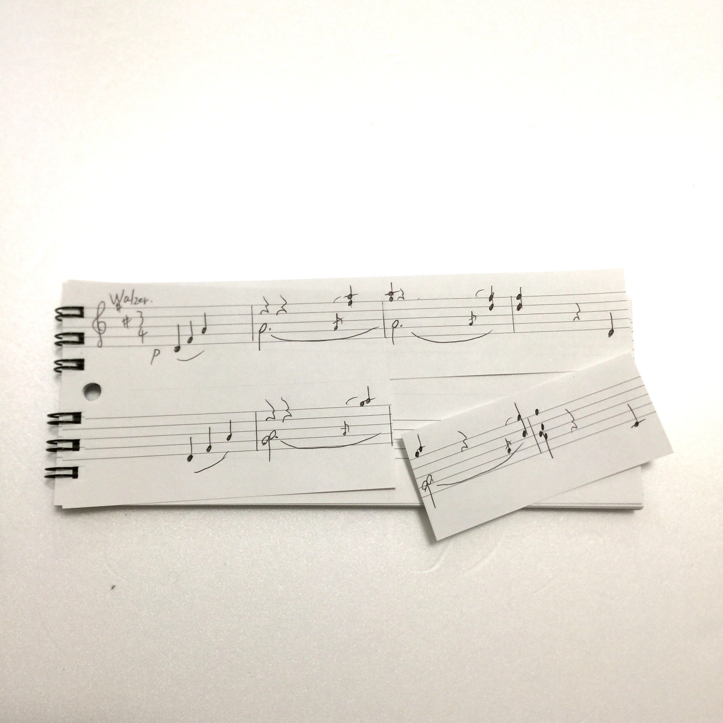 スリム五線譜のミシン目は十文字に入っています。ひとかけらあたり1~2小節書けるようになっており、必要に応じてちぎっては並べ替えたりコピーを取ったりして活用できます。ピアノの先生が生徒さんに練習してほしい部分だけを書いて渡す使い方も便利です。