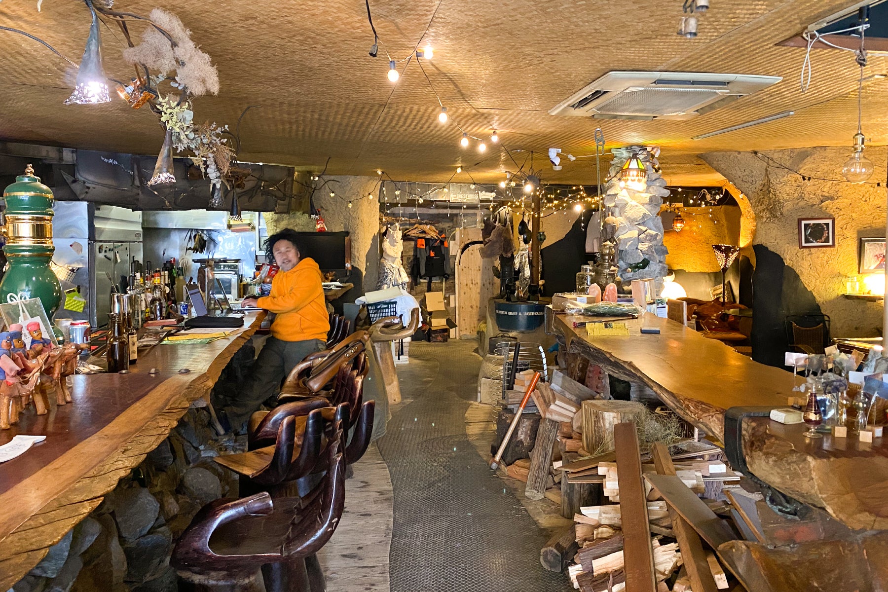長く滞在しているとお腹も減って来ます。そんな時はラウンジスペースへ、サンボが旅の中で食べて美味しかったお料理はもちろん、季節によっては山で取って来たジビエも食べれちゃいます。
