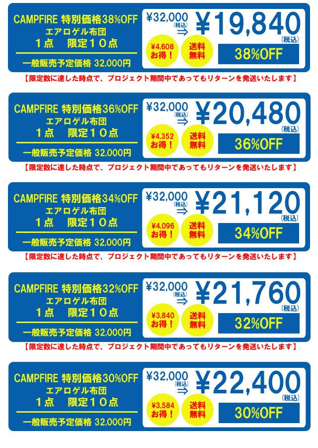 2024/01/24 13:44サポーターの皆様このたびはご支援とたくさんのお気に入りをありがとうございます。プロジェクト期間が残り5日を切りました。お気に入りをしていただいてエアロゲル布団にご関心をお持ちの方は、プロジェクトが過ぎてしまうとこのご支援額でご支援いただけなくなりますので、この機会をお見逃しなくこのプロジェクトが終了する前にご支援を賜りましたら幸いです。引き続きエアロゲル布団をよろしくお願い申し上げます。 株式会社フェリクス もっと見る