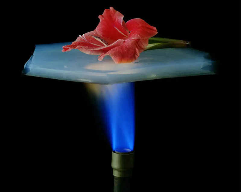エアロゲルは「断熱性」にとても優れた素材です。下からの炎にエアロゲル素材を挟むことで、熱を遮断している様子が分かります。炎で炙っていますが、エアロゲルの上に乗っている花に変化はありません。