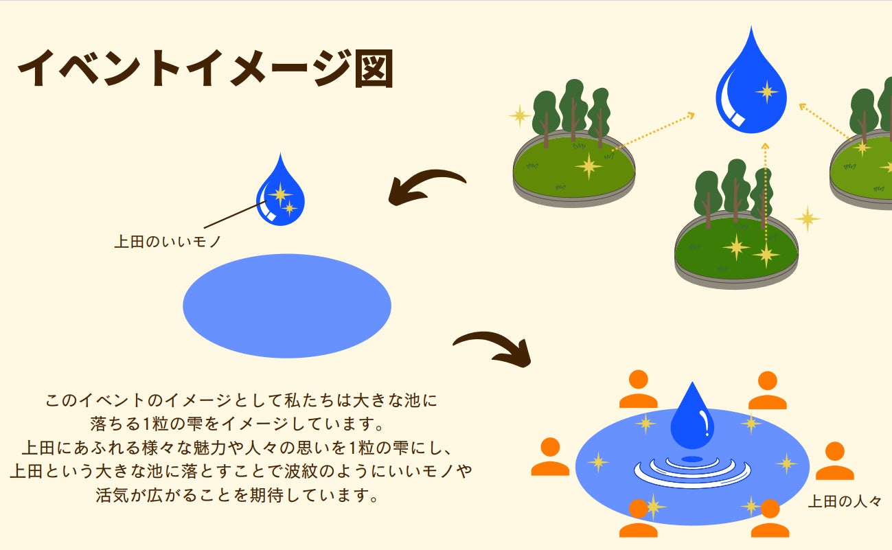 上田にあふれる様々な魅力や人々の思いを1粒の雫にし、上田という大きな池に落とすことで波紋のようにいいモノや活気が広がることを期待しています。