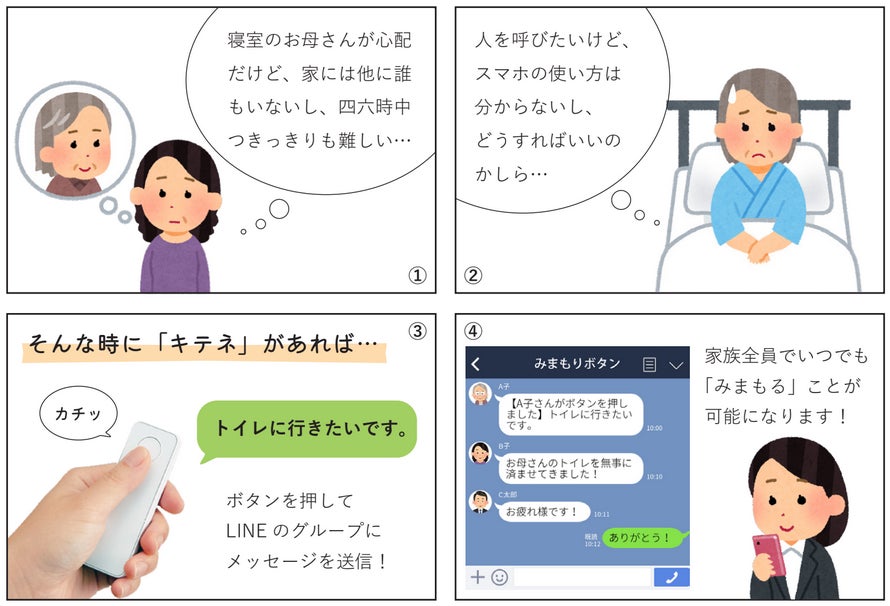 この【みまもりボタン「キテネ」】は実際に家族を介護を経験するなかで感じた「困った」を、IoT("Internet of Things =モノのインターネット)で解決するために開発した商品です。