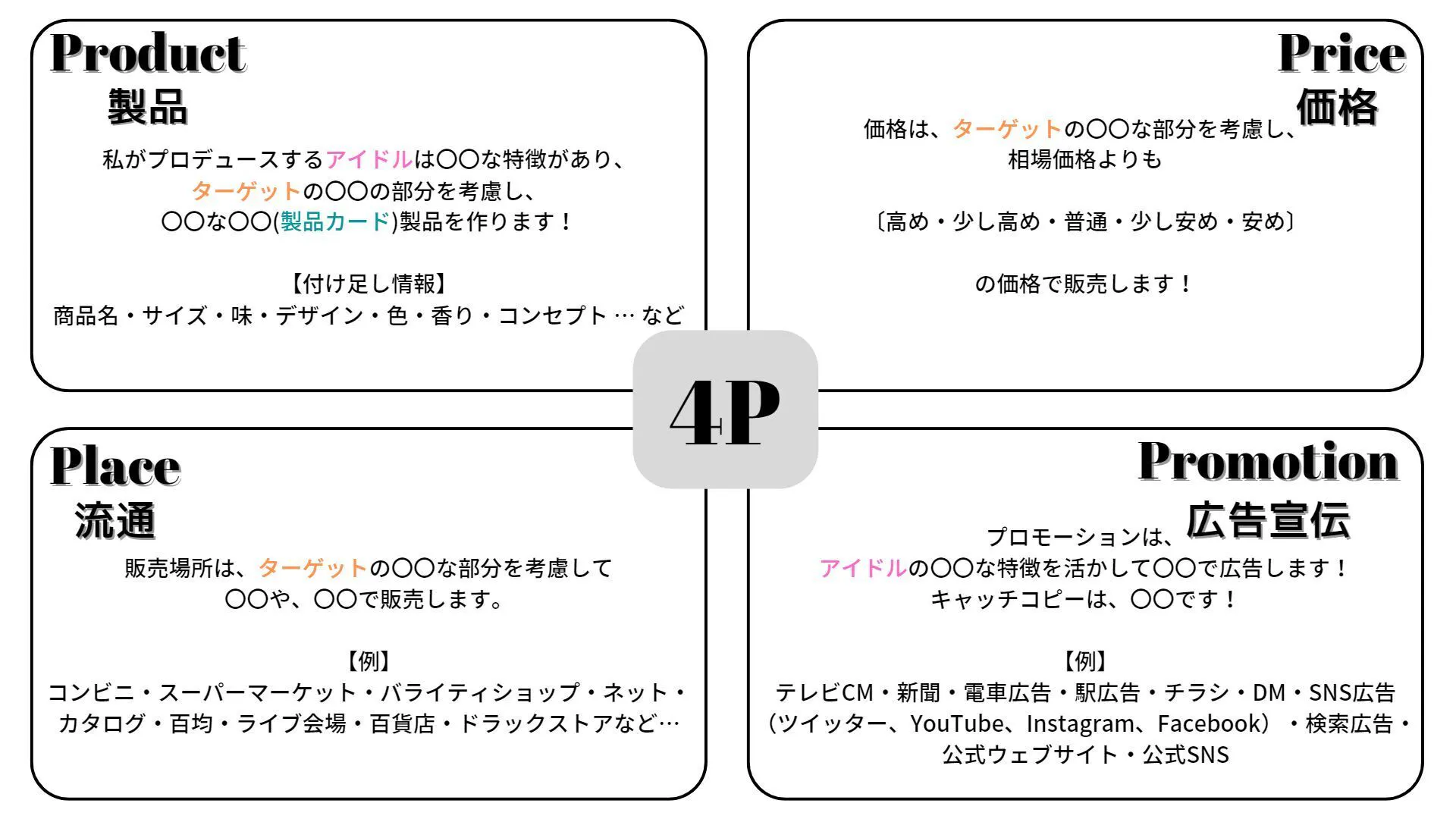 アイドルとターゲットにあった製品を4Pに当てはめて考えます。
