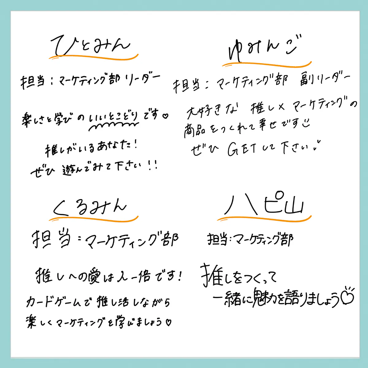 また、このカードゲームで遊ぶことでマーケティングへ興味を持ち、学んでくれる人が増えればとてもうれしいです。