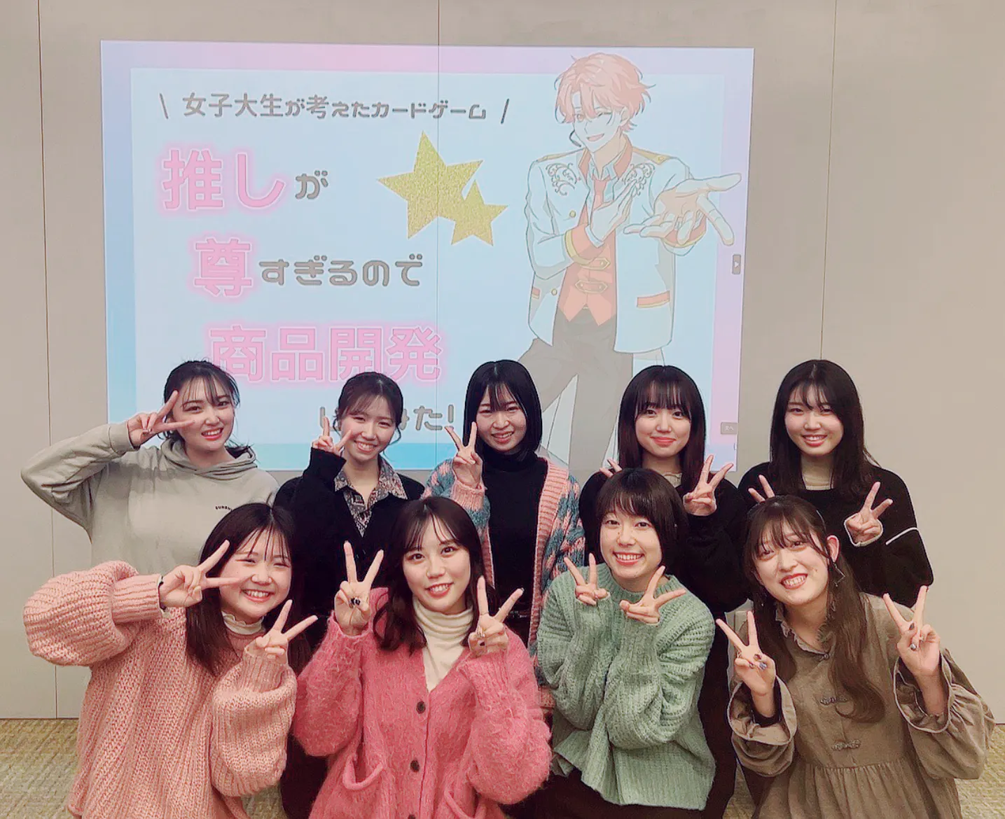 私たちは、武庫川女子大学経営学部 mcg lab (マーケティングカードゲーム製作所)です!マーケティングデザインゼミに所属する7名と、デザインを担当する同大学の情報メディア学科の学生2名で活動しています。みんなそれぞれ推し事中です♡