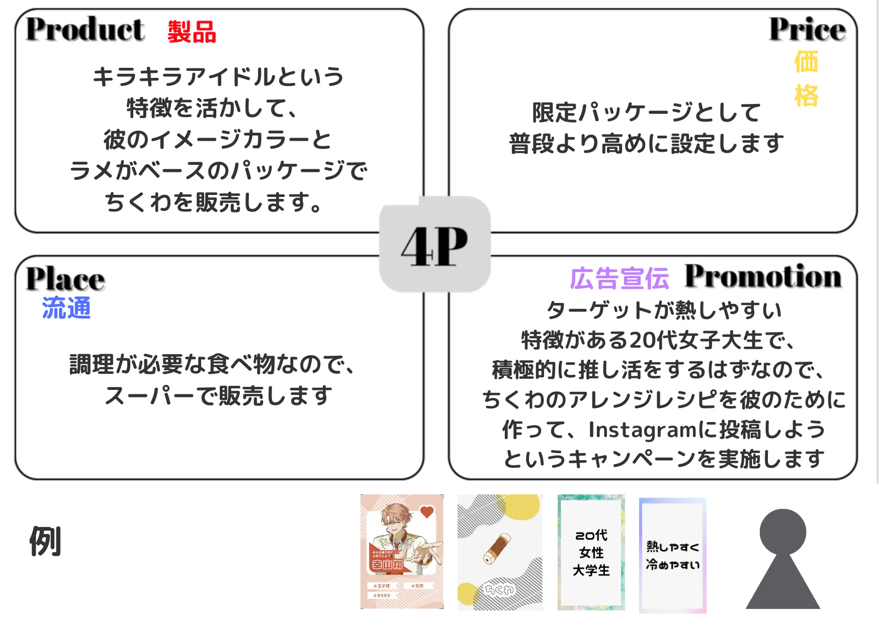 お気に入りの”推し”アイドルと売り出すグッズをそれぞれ選んで、「4P」を使って考えた商品の魅力をプレゼンしてください!