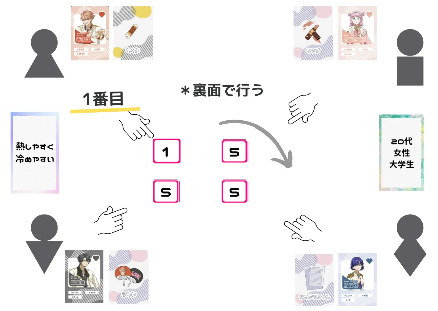 補足情報を上にして山積みにし、上から一つカードを裏向けて並べてください。