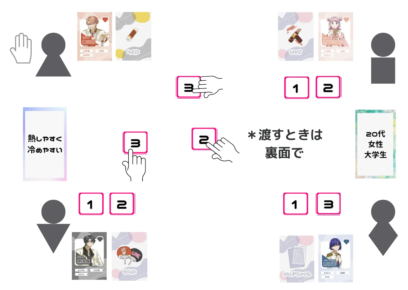 評価カードを全員に支給してください。人数-1までの数字を使います。1人が1種類ずつを全て持っている状態支給します。
