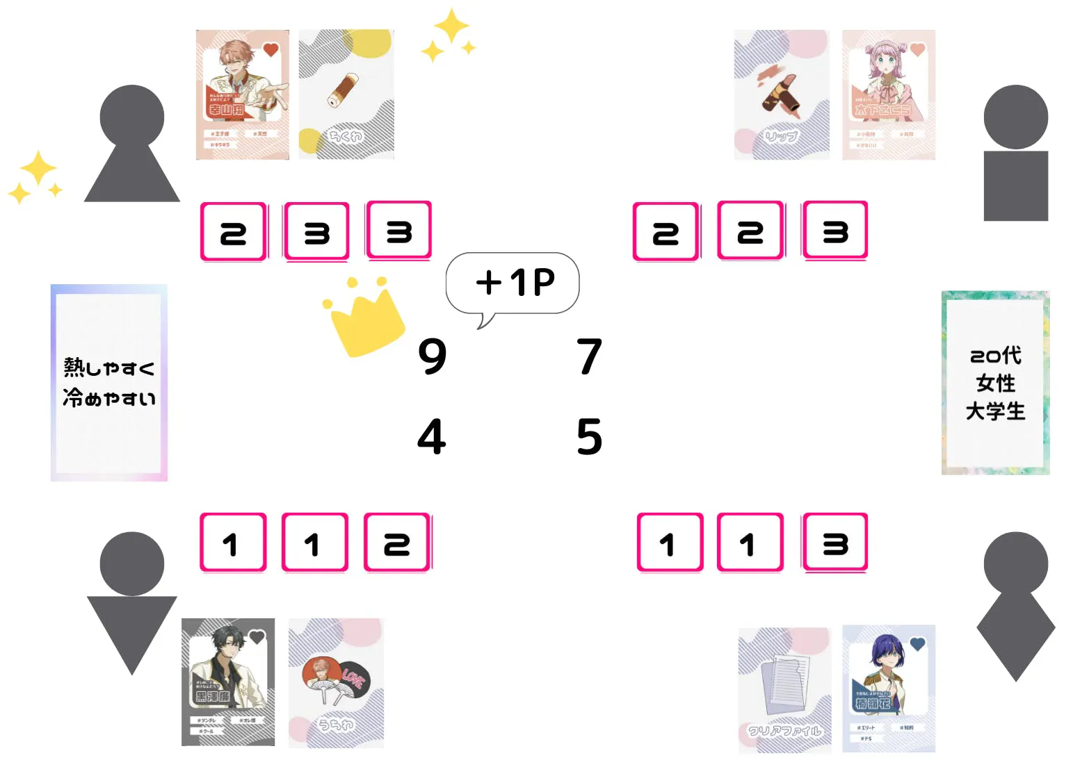 もらったポイントを集計し公開します。 さらに、製品カードがハプニングカードだった場合1点が加算されます。