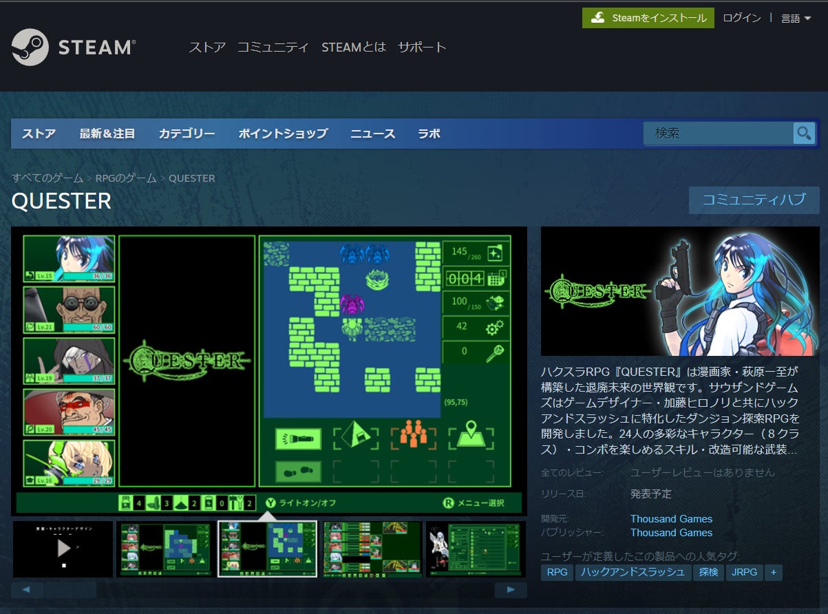 サウザンドゲームズの桑原です。ついに!ハクスラRPG『QUESTER』の家庭用ゲーム機版『METRO QUESTER』の発売日が決定いたしました。KEMCOより発売され、対応機種は【Nintendo Switch™ / PlayStation🄬5 / PlayStation🄬4 / Xbox Series X|S / Xbox One】となります。ここまでこれたのは、クラウドファンディングでご支援頂いた皆様のお陰です。本当にありがとうございます。また、直近で様々な大型施策をスタートしております。Podcast番組『QUESTER'S GUILD』ショートボイスドラマ「リサの探索ダイヤリー」レトロゲームサミット出展etc.是非、弊社のホームページやSNSにアクセスしてください。『QUESTER』の世界を広げられるよう、今後も努力していきます。引き続きよろしくお願いいたします。https://www.thousandgames.net/https://twitter.com/1000games_prサウザンドゲームズ 桑原敏道