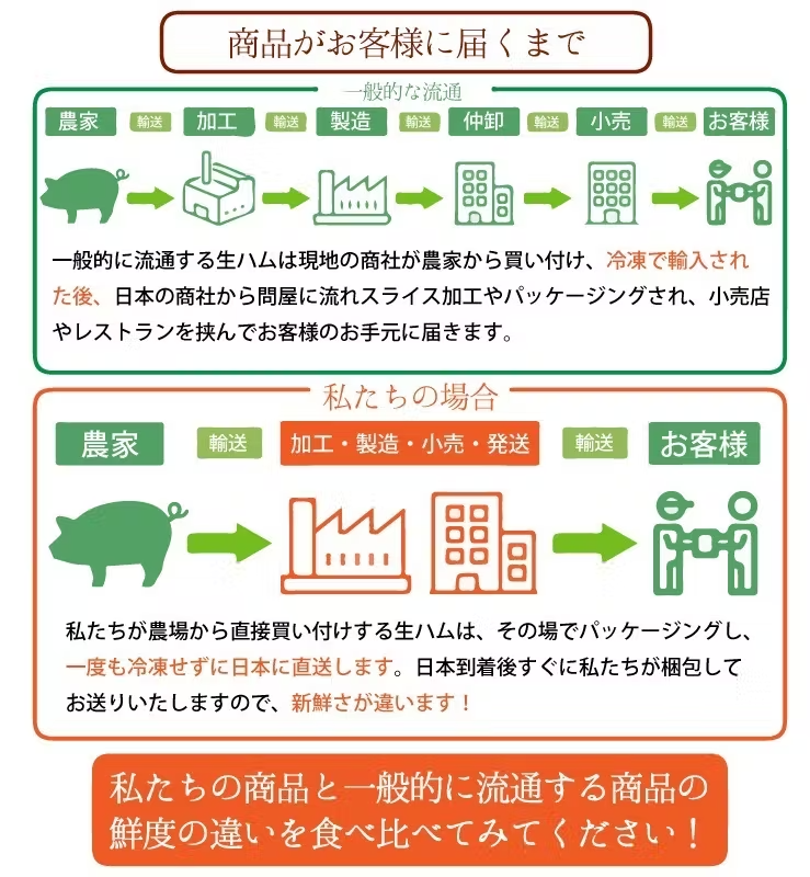 生ハムを輸入し、皆様に生ハムをお送りしたいと思います!