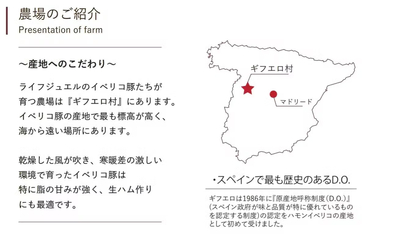 「スペインの生ハムを選ぶときに、オーナーとしてまず最初に思い浮かべるのはギフエロ産のハモンイベリコでしょう。私たちは幼いころから生ハムに触れているので、良い生ハムはどんなものであるかを知っています。しかし、日本の皆様は100種類近い生ハムに触れる機会は滅多にないと思います。まずは、ギフエロのイベリコ豚を知って自分に合ったものを探し出すことがおすすめです。今回の生ハムは私たちのお店でも20年以上使っている商品です。ぜひ食べてスペインを感じてください」
