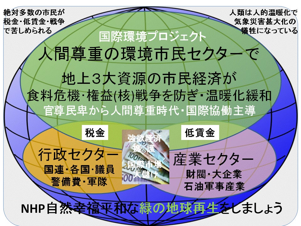 2018年末、私に胃がん(リンパ腫)の疑いが出て、2019年5月に入院予定をしていました。 ところが、2019:5月ネット上で2つの世界的情報「①40年前:石油メジャーが国際世論誘導」と「②豪国機関が2050年:人間社会の崩壊警告」のブログがありました。 1992年「気候変動枠組条約」に世論誘導による原因変節の誤りがあり、人間社会崩壊を早くしている国際的な証拠で大変重大な事と思い、私は入院すると研究調査・啓発活動ができないと入院中止しました。 それで病気克服を実施しながら、ネット情報調査やSNS啓発・新潟の県議会と市議会へ陳情等ができました。 ※2023年12月に病気克服で完治ができました。 石油メジャーの世論誘導の経緯… 1988年:米国上院:委員会で「温暖化は化石燃料による原因が、99%確率であると決議報告」があって、石油メジャーは「石油利益に影響すると米国産業界(23万企業)と組んで1989年「世界気候連合」を結成・市民権を得て、3年もかけ「環境大臣会合」「世界気候会議」「枠組条約交渉会議」等に科学的な世論誘導を行ったそうです。結果「気候変動枠組条約」には、石油使用や森林伐採の規制がなく、内容要点は、①「人間活動の温室効果ガスが原因」の気候変動である。②効果ガス排出削減が濃度安定化「その排出量削減枠」を決める。③効果ガス削減安定すれば気候変動を保護する。 ※全般的に単独に存在しない温室効果ガス(無理にCO²含む)と言いくるめ、①産業界が70%使用する化石燃料CO²が原因の温暖化と言わず」にいる。 ②CO²濃度増加が気温上昇する現象を隠す.③CO²濃度低減が気温を下げて地球温暖化を緩和するを知らせない。 さらに2013年IPCC5次報告では、①気候システムにおいて95%人的温暖化であり、②排出されたCO²は200年以上も消えず温暖化に影響する。 ③CO²濃度増加と気温上昇は比例関係にある。と20年たって漸く、記述しています。 なぜ 暑くなるの? 太陽の赤外線が大気中で二酸化炭素(CO²)との分子振動発熱が起き、熱拡散吸収され暖かくなりこれが気温を上げる原因で、CO²濃度が危険水準を超え振動発熱が危険な猛暑になっているのです。逆に言えば、光合成の緑化事業でCO²吸収削減すれば、濃度及び気温が下がり温暖化の緩和になる事がとがわかりました。 知ってか(犯罪)知らず(過失)「国際社会はCO²濃度と気温は下げられないので環境破壊及び甚大な温暖化災害」を世界中に多発させ、膨大な市民の犠牲者を出しています。 それなのに「気候変動枠組条約・締結国会議:COP」が対策をリードし「国際条約」なので、公共:第1セクター(行政・学校・議会)、民間:第2セクター(大企業・報道・学者・政党)等はこれに反する言動はできないのです。 それには、世界の絶対多数の市民の希望「自然・幸せ・平和な緑の地球再生」プロジェクトによる市民:第3セクター(地球環境を課題にする個人・企業・団体・行政)が「地球規模で無限に3大資源を満たせる運動」で協働主導を行う「地球環境修復の市民連合(仮称)」創設が必要と思います。同時に国際条約改正の必要性を、国際社会及び個人‣団体へ知らせ賛同参加を広める運動になります。