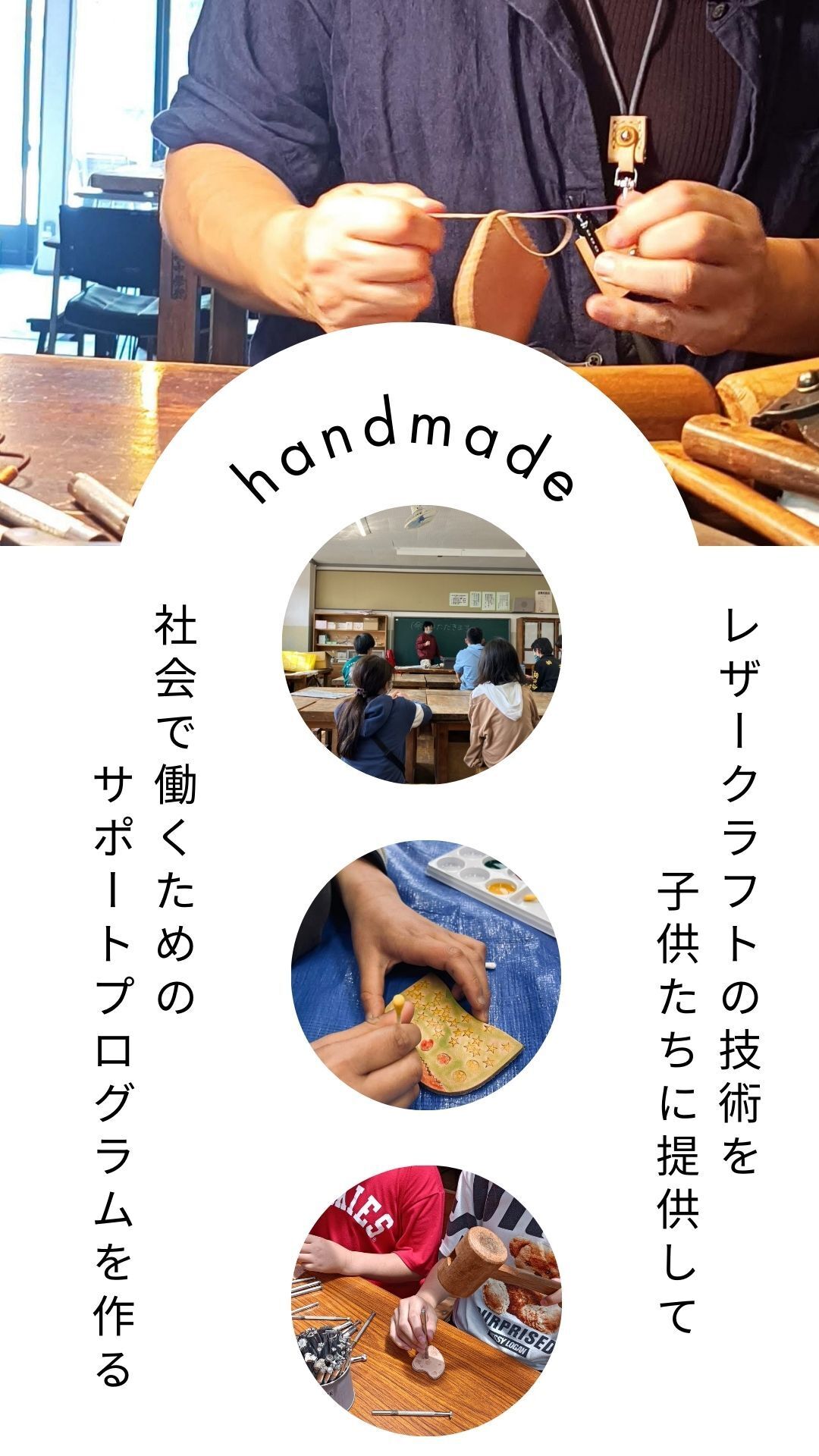 2018年に飯田市内の不登校児童にレザークラフトを教えた事をきっかけに本格的に不登校支援を始め、現在は南信州内教育委員会、小中学校,社会福祉協議会と連携をしながら活動広げています。しかしまだ田舎では不登校児童に対しての誤解や周囲の厳しい目があります。その結果、子供たちは自己肯定感を奪われ社会で孤立していきます。学校以外の場所でも社会性を学べる環境と義務教育を終えた後の支援体制を整えなければこの課題は何も解決しないと思いました。