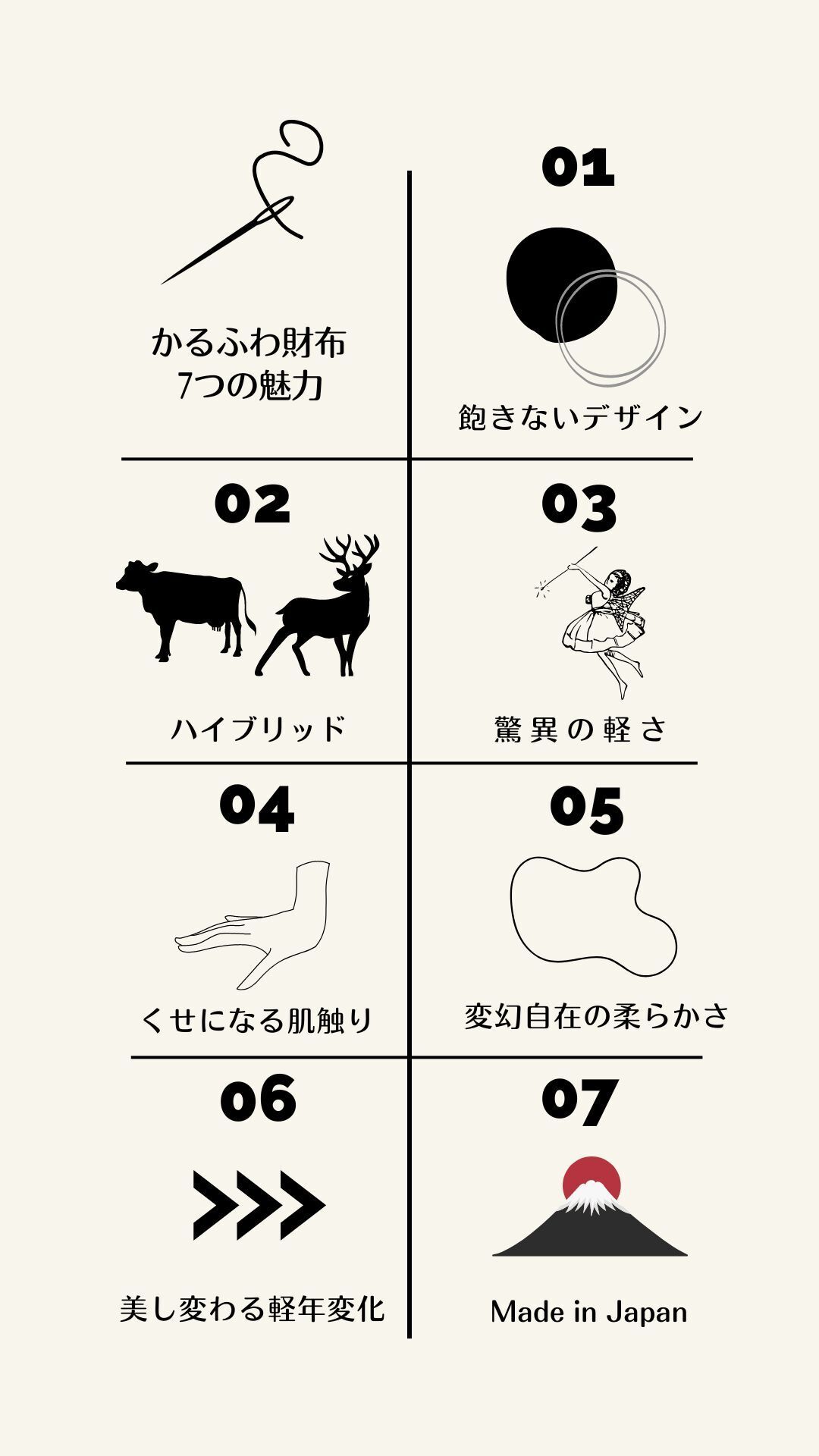 鹿の革は柔らかさと繊細さが特徴であり、牛の革は耐久性と強さを備えています。鹿の革と牛の革の個性を融合させたハイブリットな財布は、その独自の魅力で注目を集めています。この財布は、鹿の革と牛の革の素材の特性を巧みに取り入れ、一つの作品に仕上げられています