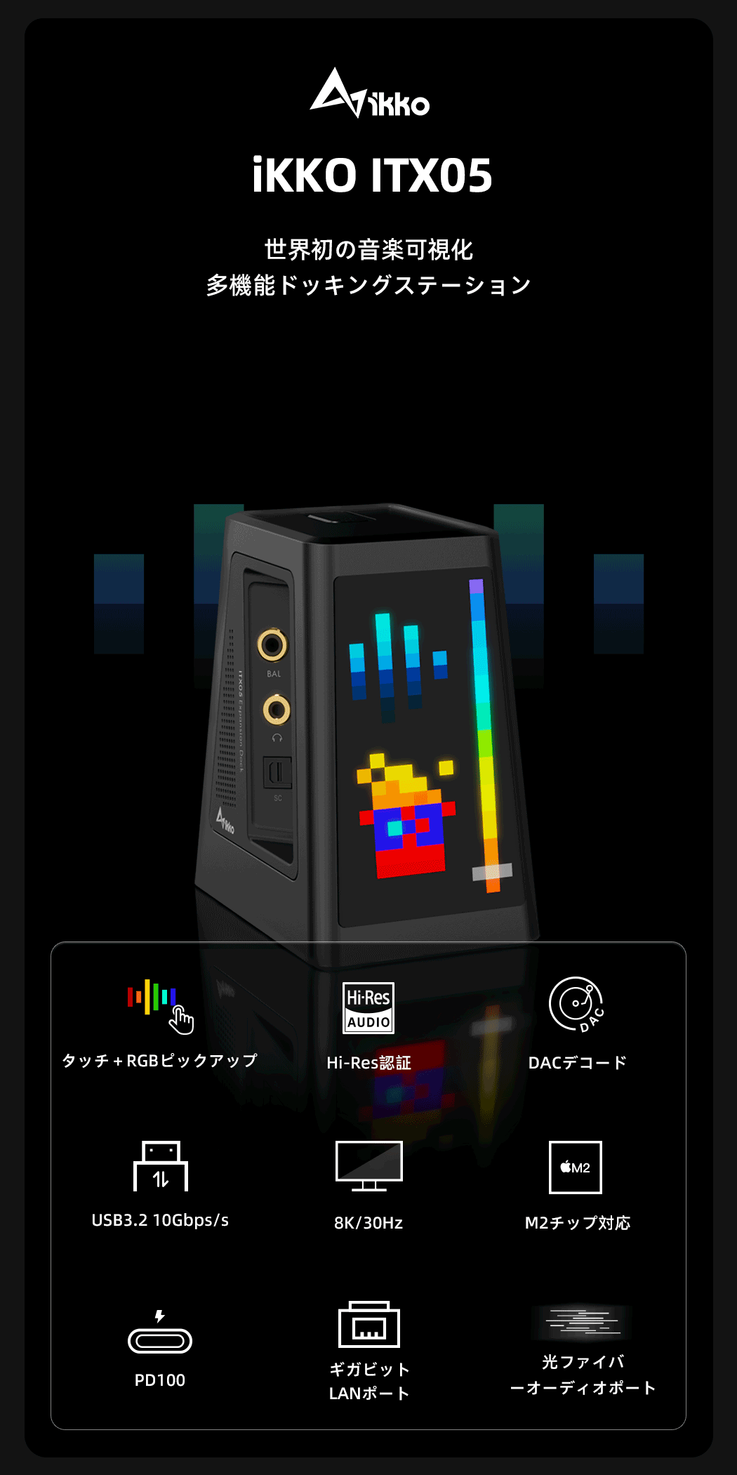 ITX05は、音楽を「見る」ことができるインタラクティブ・ドックです。8K HDMIポート、Type-c PDとデータポート、USB 3.2ポートなどを備え、ポート数が限られた最新のノートパソコンやMacBookに最適で、MAC OSとWindows Type Cに対応している。また、プロフェッショナルオーディオDSPチップとESSフラグシップデコーディングチップ、新しいマトリクスディスプレイインタラクティブ技術、圧縮可能なフロントインターフェースカバー、多数のプロフェッショナルオーディオ拡張ドッキングインターフェースなど、最も理想のワークステーションとなるような機能が備わっている。