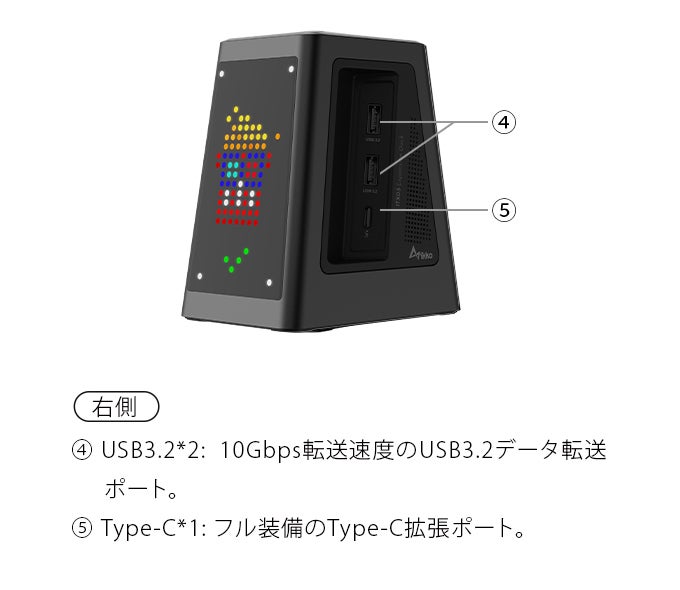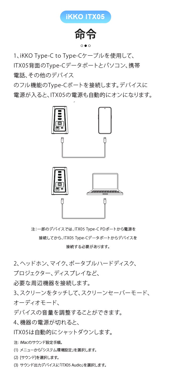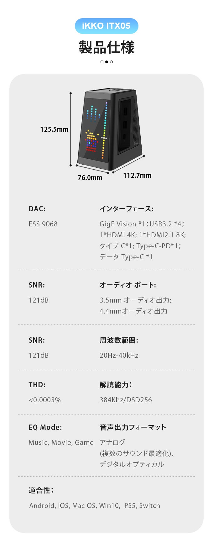 ITX05は、人生の冒険しながら優れたサウンドクオリティを求める人に最適なドックです。このコンパクトなワークステーションは、ESSチップを搭載し、ゲームや映画用に3.5mmステレオおよび4.4mmデュアルモノ出力を提供する。お気に入りのメディアフォーマットのあらゆるシーンで、より没入感のあるリスニング体験を提供する。また、DAC(デジタル・アナログ・コンバーター)を内蔵し、ハイパワー設計により、常にピュアなサウンドを楽しむことができる。)