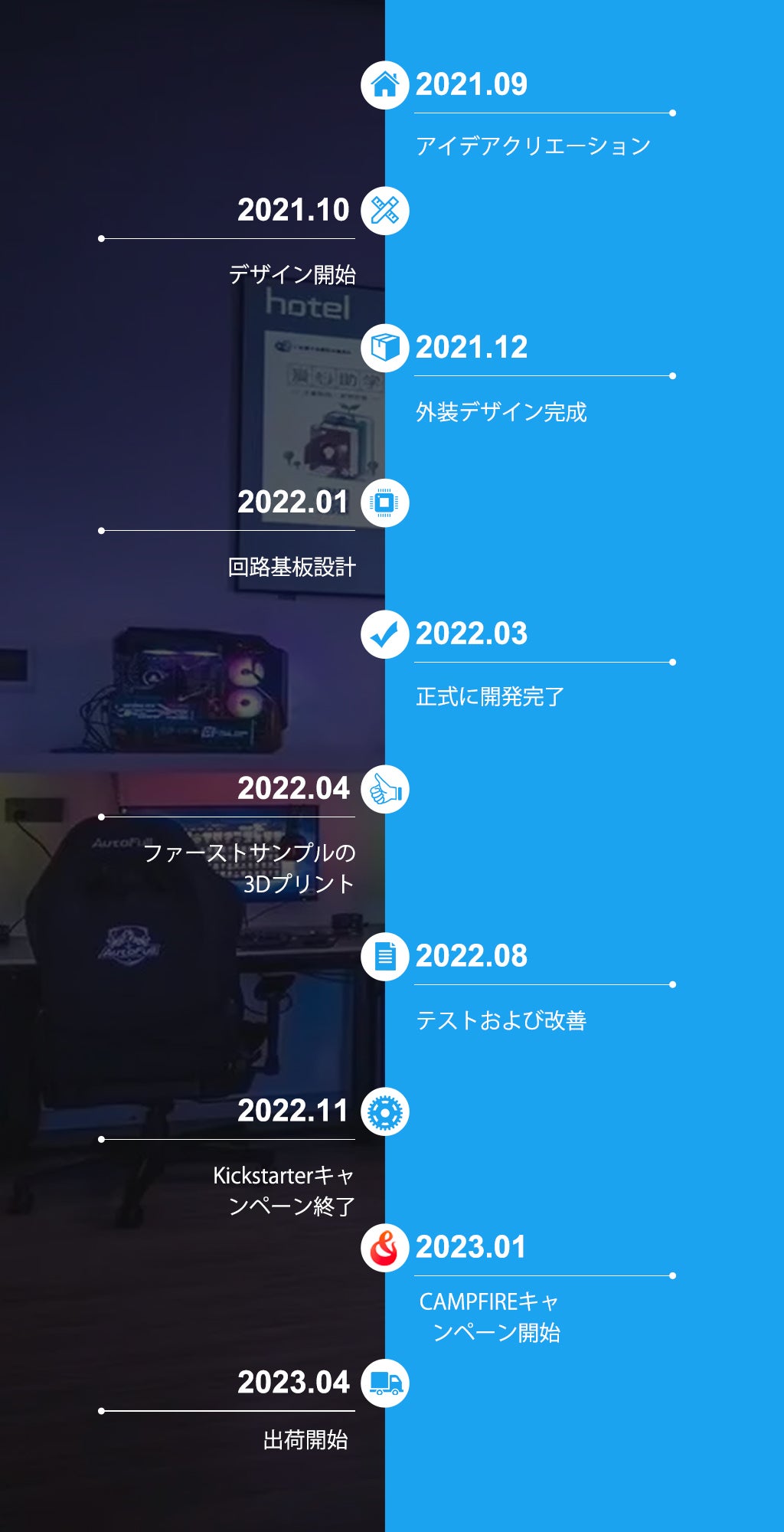 現在、専門メーカーと提携し、ITX05ドッキングステーションのフル生産サービスを行っています。CAMPFIREのイベントが始まる前に、すでに金型を用意し、そして大量生産へ。キャンペーンが終了し、CAMPFIREプラットフォームで集めた資金が入金された時点で、ITX05のお届けを手配いたしますので、予定通りお届けできるものと確信しております。