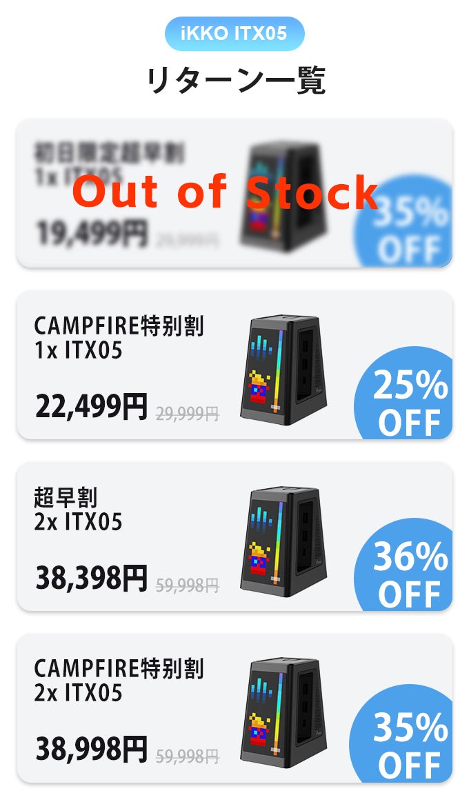 2023/03/04 00:00支援者の皆様へ。ご支援ありがとうございました。私たちのキャンペーンはついに終わりを迎えました。この魅力的なオールインワン・ドッキング・ステーションを一日も早くお届けすることを、多くの皆様が心待ちにされていることと存じます。製品の生産は順調に進んでおり、4月上旬には出荷が開始される予定ですので、ご安心ください。この間、私たちはこのプロジェクトに関する重要な情報を共有し、透明性を保つことに努めます。なお、正式な発送を開始する前に、住所の変更が可能です。以下の手順で手続きを行ってください。→ CAMPFIRE・お届け先(メンバー特典の受け取り先住所)の変更についてご不明な点がございましたら、メール(ikkoaudio@gmail.com)にてお問い合わせください。キャンペーンを見逃した場合、またはITX05ドッキングステーションをご自分や大切な人のために追加したい場合は、当社の公式ウェブサイトをご覧になってください:ikkoaudio.comありがとうございました。iKKO Audio チーム もっと見る