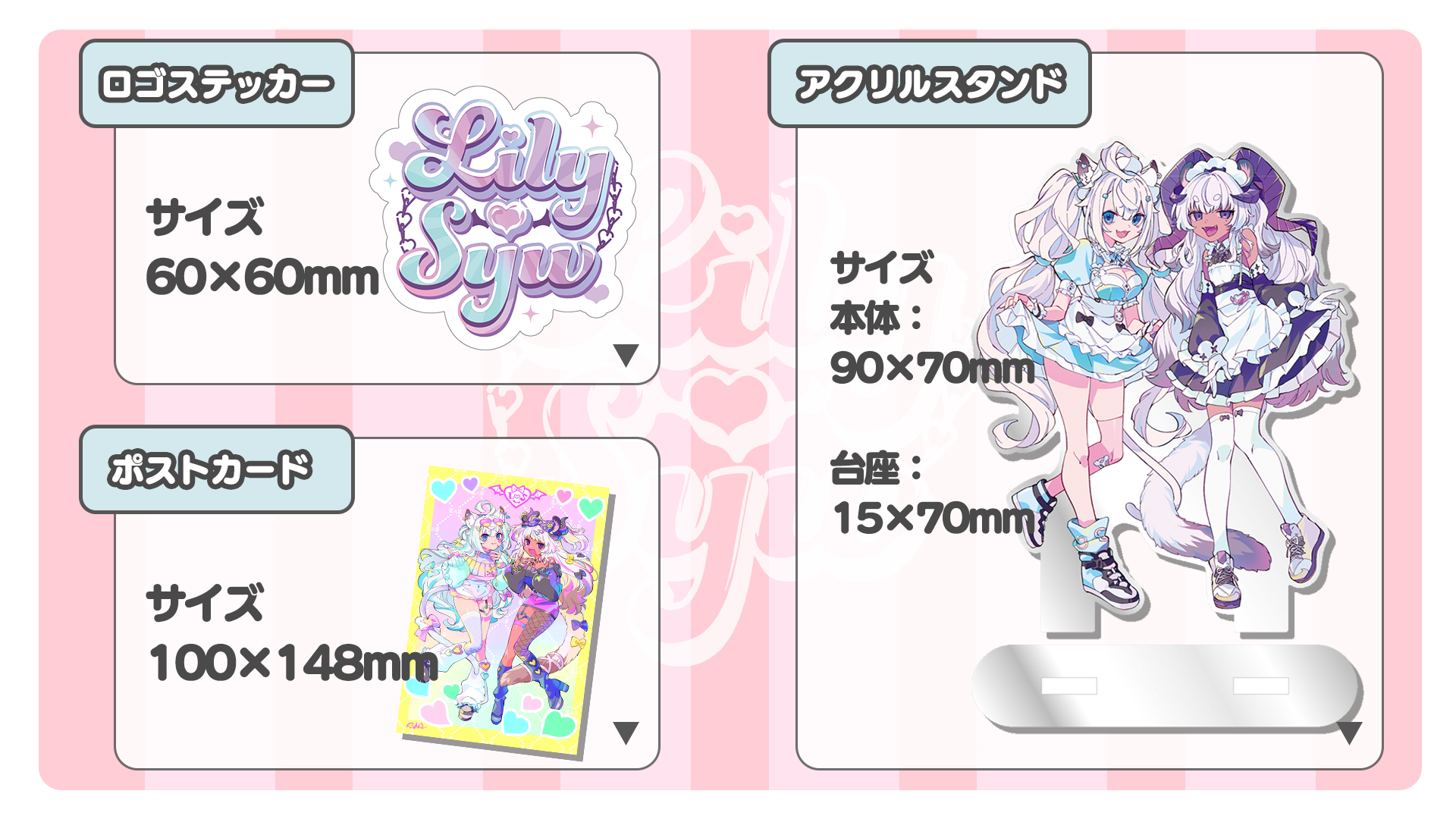 KVグッズぷらんに含まれる3点をご紹介!■ ロゴステッカーLily♡Syuのロゴステッカーです。サイズ:60×60mm※7月~8月到着予定■ ポストカードLily♡Syuのキービジュアルを使用したポストカードです。サイズ:100×148mm※7月~8月到着予定 ■ アクリルスタンドLily♡Syuのメイド服姿を使用したアクリルスタンドです。本体:90×70mm台座:15×70mm※7月~8月到着予定