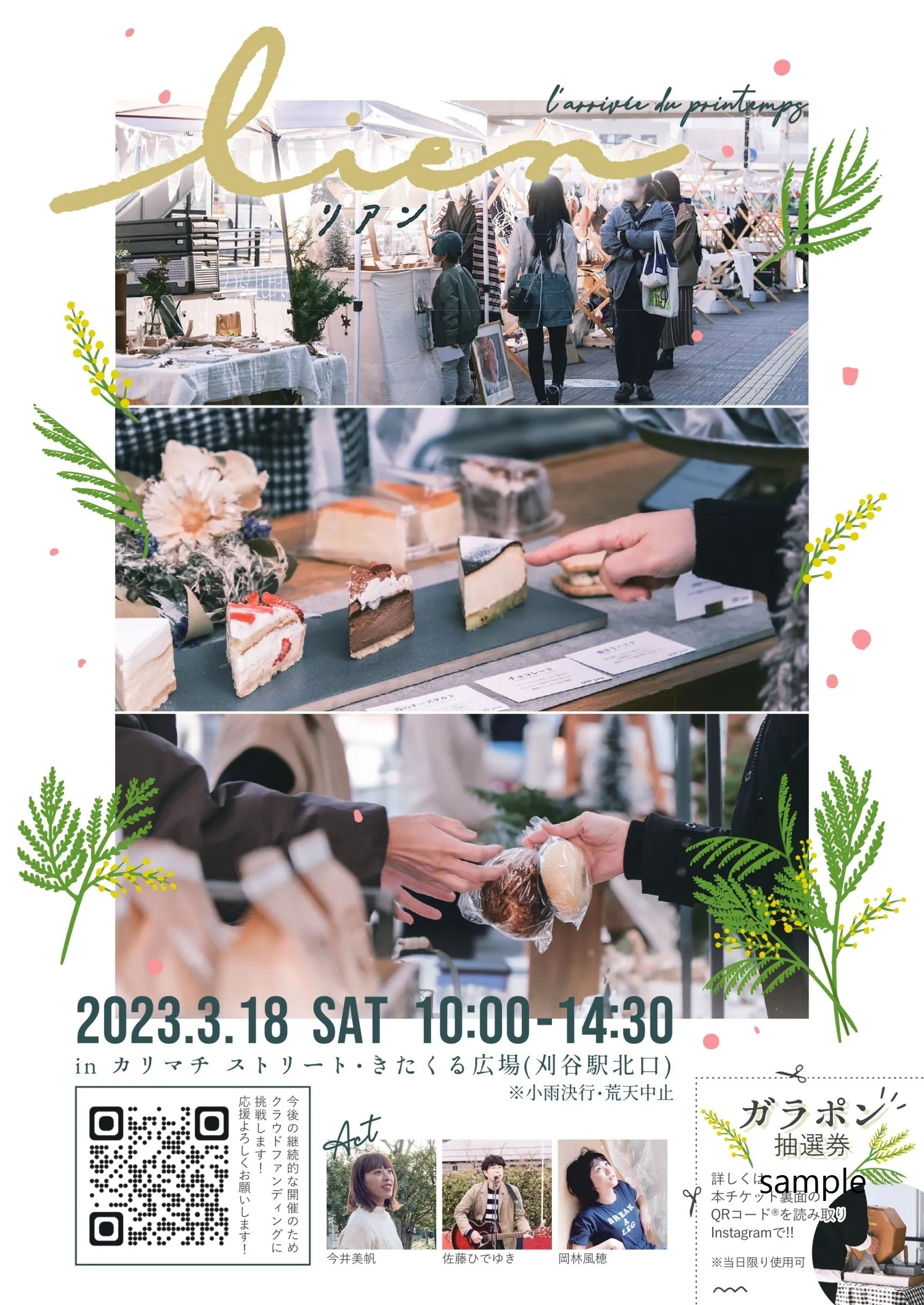 2023/12/09 09:00lien-リアン-運営担当の河村です。いつも『lien-リアン-』を応援していただき、ありがとうございます。第6回『lien-リアン-』 が明日となりました。とってもいい良い天気に恵まれそうです。今回はリアンにとって、最大の出店者数です!素敵な出店者をお招きしております!食べて楽しい、見て楽しいが盛りだくさんな空間となっております。是非、ゆっくりお過ごしください*注意:リターン品のショッピングチケット(500円券)の有効期間が12月開催までです。まだ、お使いでない支援者様はご来場をお願いします。◉次回開催日◉ 『lien-リアン-』Vol.6Marché de Noël“Noël”な1日になるようにプレゼントや限定商品など揃えてお待ちしております令和5年12月10日(日)時間:10:30-15:00※小雨決行・荒天中止会場: きたくる広場(刈谷駅北口)・カリマチ ストリート・刈谷駅南北連絡通路(一部)主催:NPO法人 まちづくりかりや後援:刈谷市「刈谷」という街にもっと寄り添い、継続的に皆さまから愛されるマルシェを目指して、これからも行きたくなる素敵な空間をつくります!是非、お越しください! もっと見る
