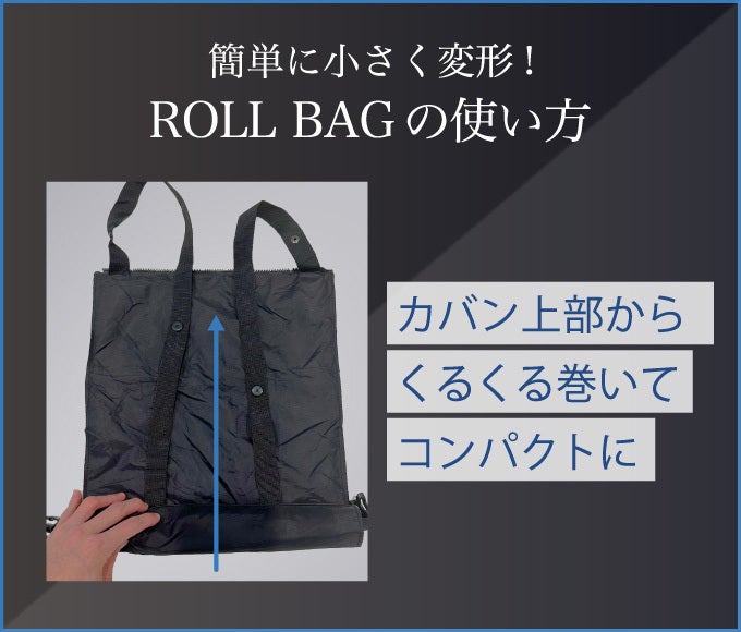 ROLL BAGは、リュック・手持ち・ショルダー 3つのスタイルをお楽しみいただけます。好きな形に変形してご利用いただけるのが特徴です。